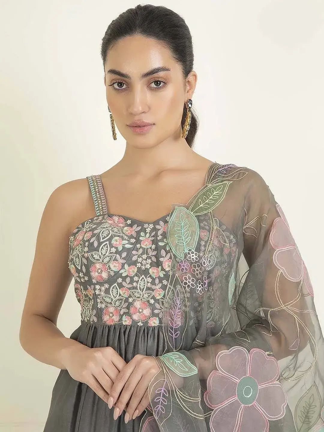 Grey embroidered Kurta with Palazzo with Dupatta Kurta design: Floral embroidered Anarkali shape Regular style Shoulder straps, sleeveless no sleeves Thread work detail Calf length length with flared hem Pure cotton knitted and woven fabric Palazzo design: Solid Palazzo Drawstring closure Pure cotton knitted and woven fabric Dupatta design: Embroidered Dupatta Scalloped borders