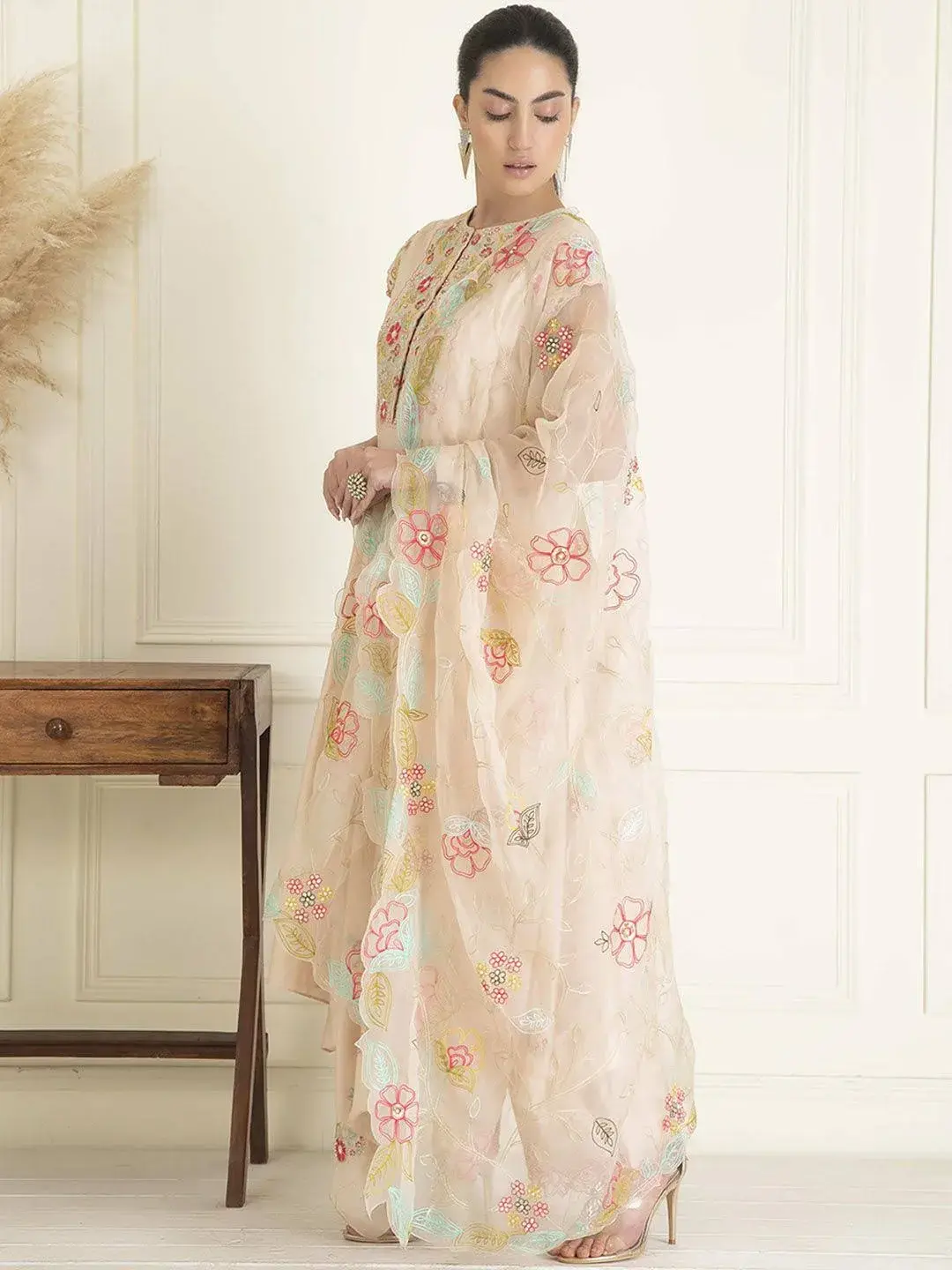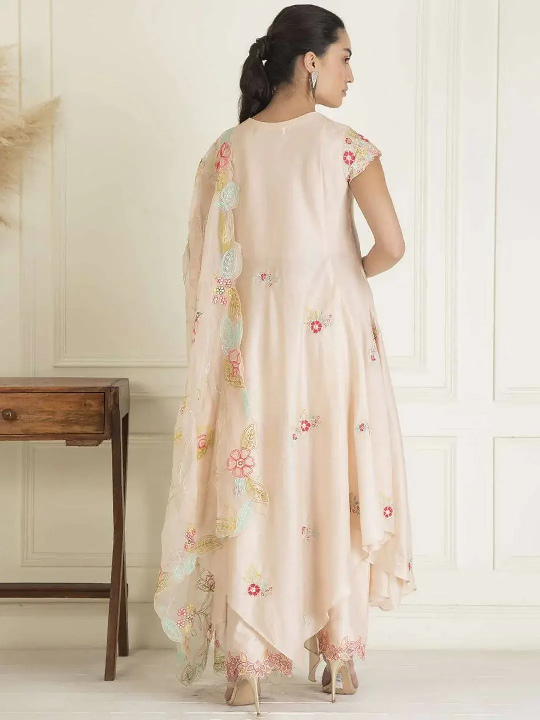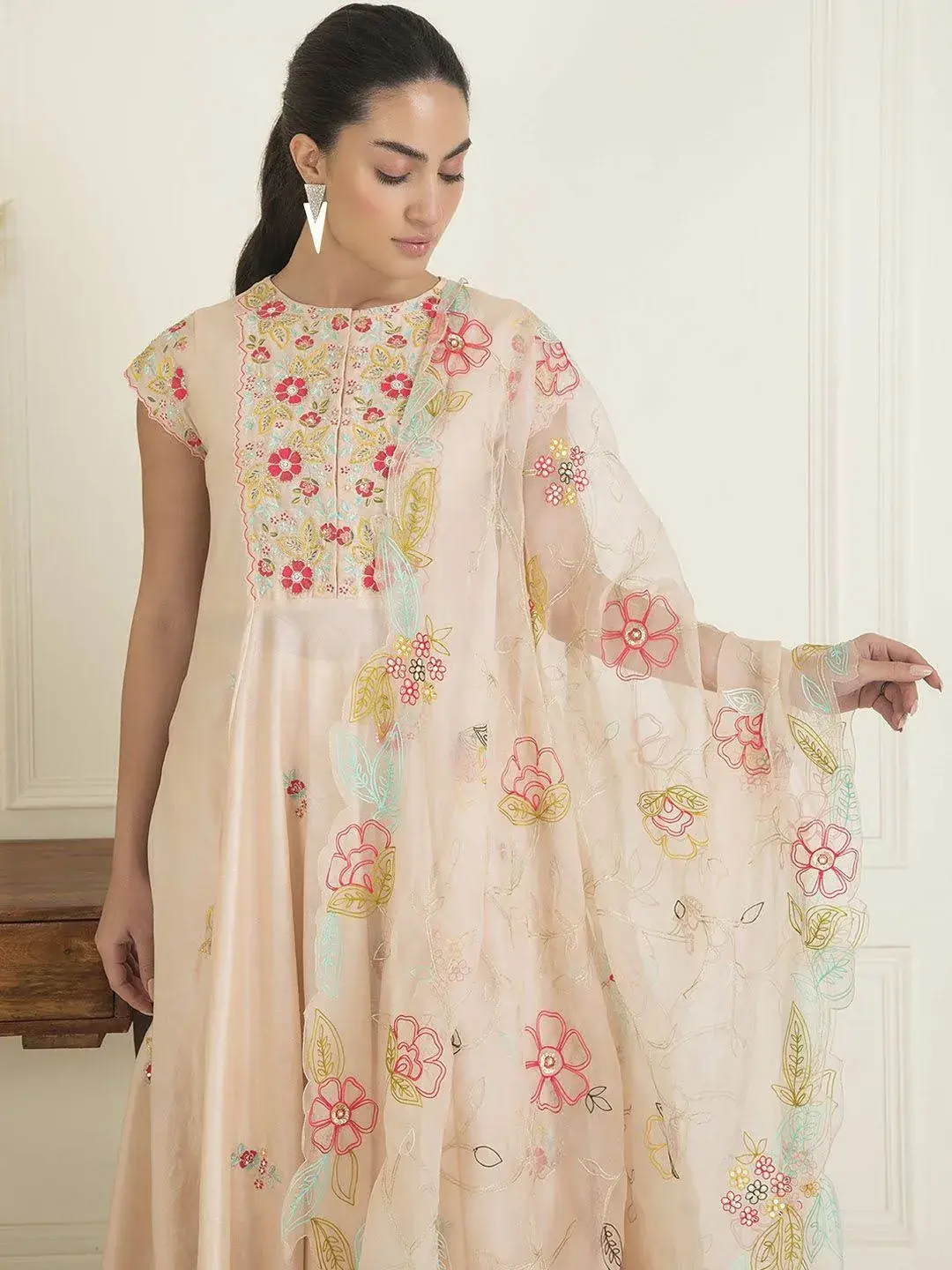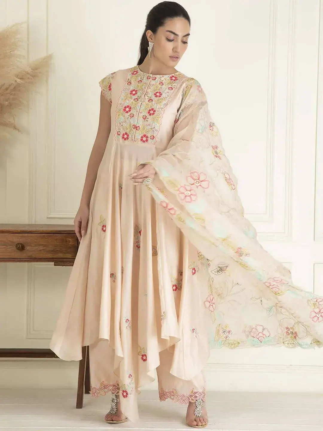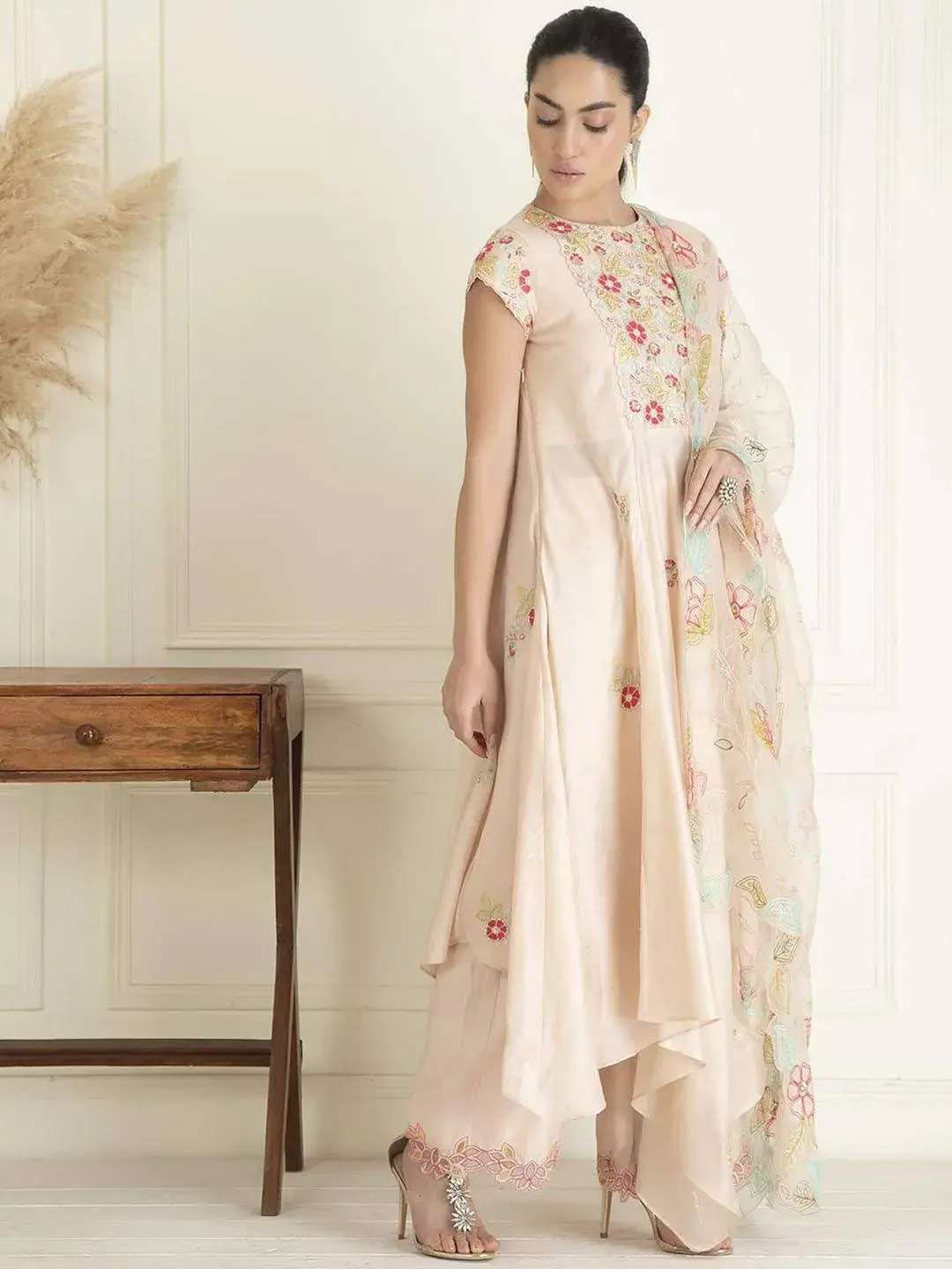 Peach embroidered Kurta with Palazzo with Dupatta Kurta design: Floral embroidered A-line shape Regular style Round neck, short regular sleeves Thread work detail Calf length length with flared hem Pure cotton knitted and woven fabric Palazzo design: Solid Palazzo Drawstring closure Pure cotton knitted and woven fabric Dupatta design: Embroidered Dupatta Scalloped borders