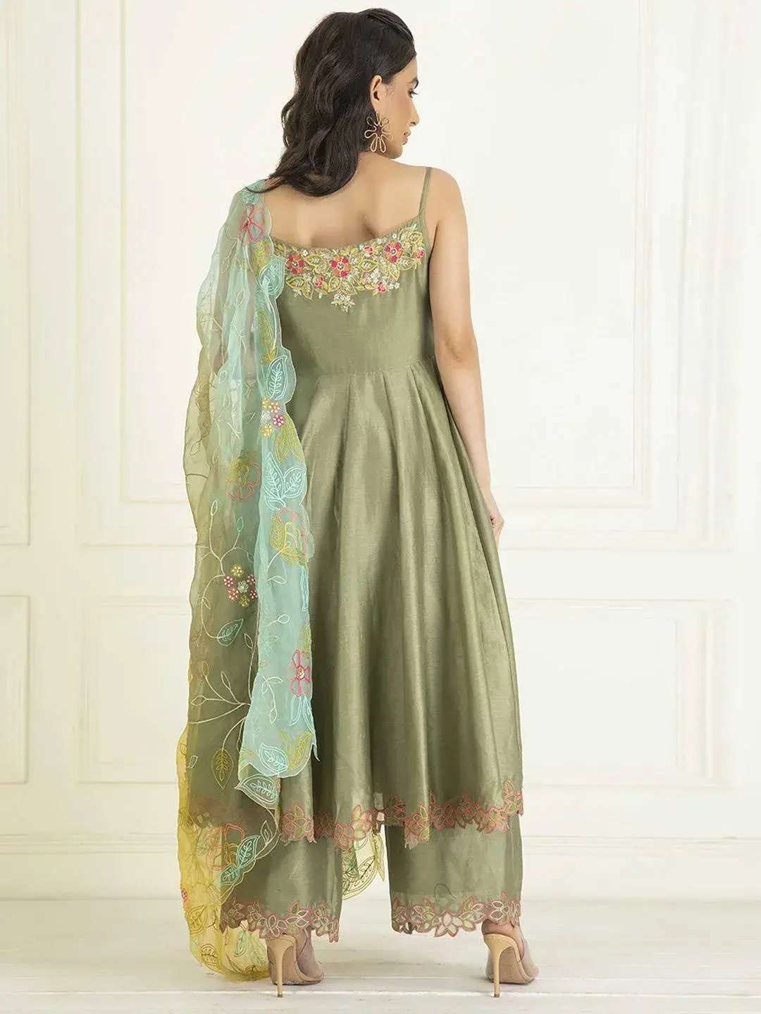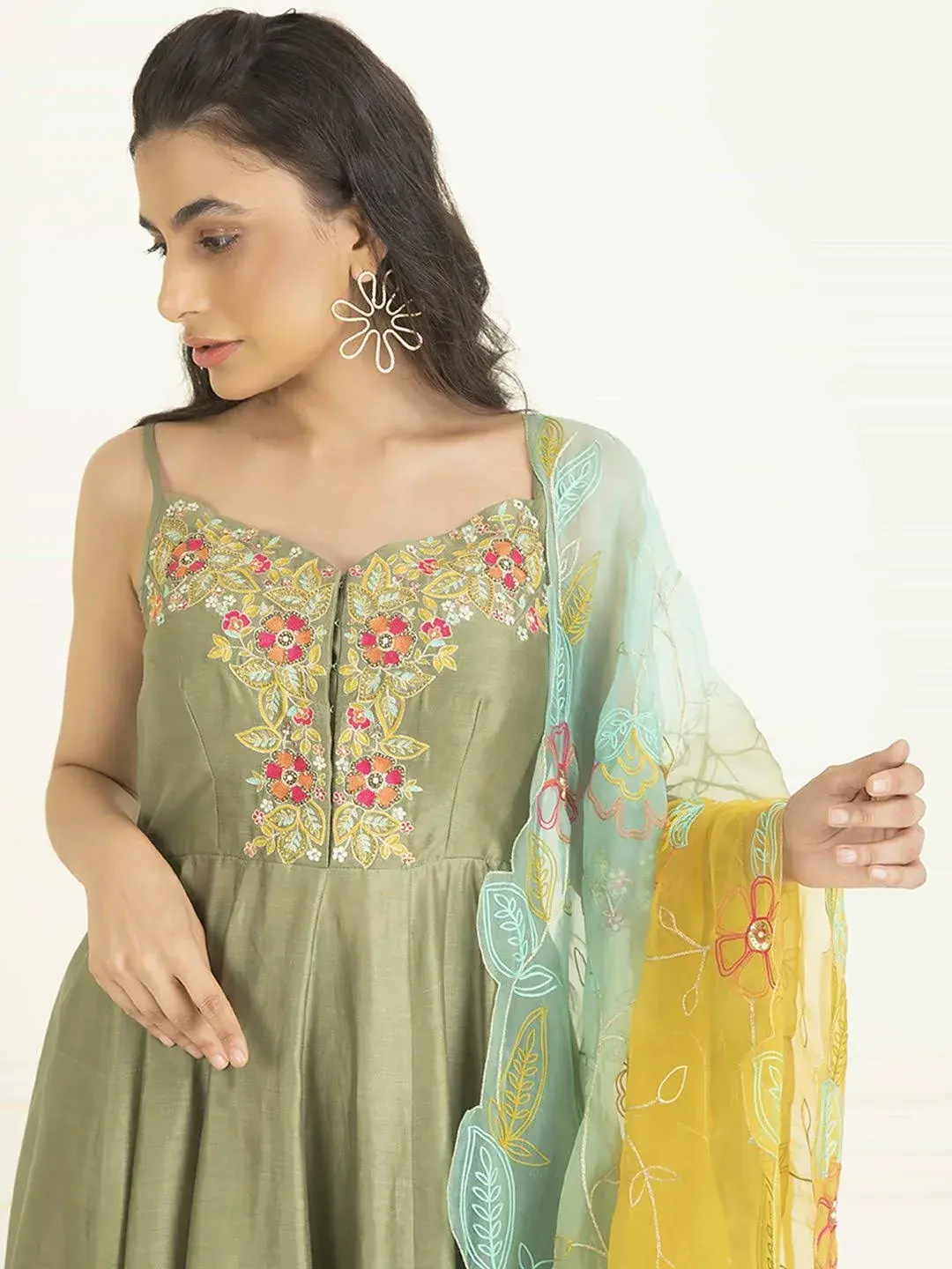 Green embroidered Kurta with Palazzo with Dupatta Kurta design: Floral embroidered Anarkali shape Regular style shoulder straps neck, sleeveless no sleeves Thread work detail Calf length length with flared hem Pure cotton knitted and woven fabric Palazzo design: Solid Palazzo Drawstring closure Pure cotton knitted and woven fabric Dupatta design: Embroidered Dupatta Scalloped borders