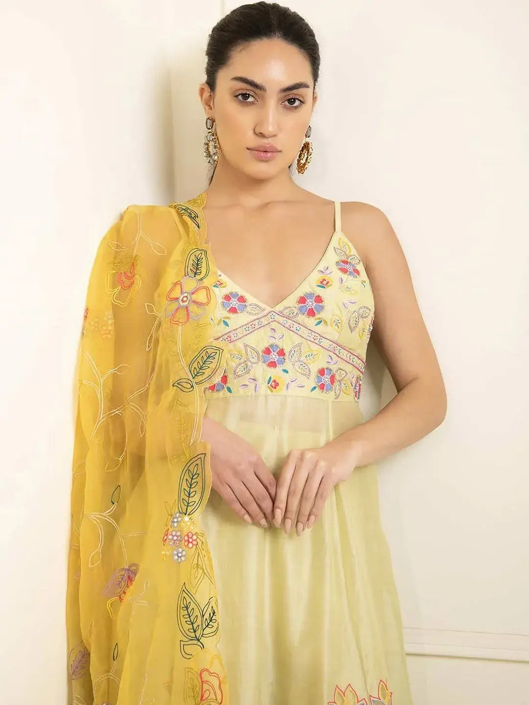 Yellow embroidered Kurta with Palazzo with Dupatta Kurta design: Floral embroidered Anarkali shape Regular style Shoulder straps, sleeveless Calf length length with flared hem Pure cotton knitted and woven fabric Palazzo design: Solid Palazzo Drawstring closure Dupatta design: Embroidered Dupatta Scalloped borders