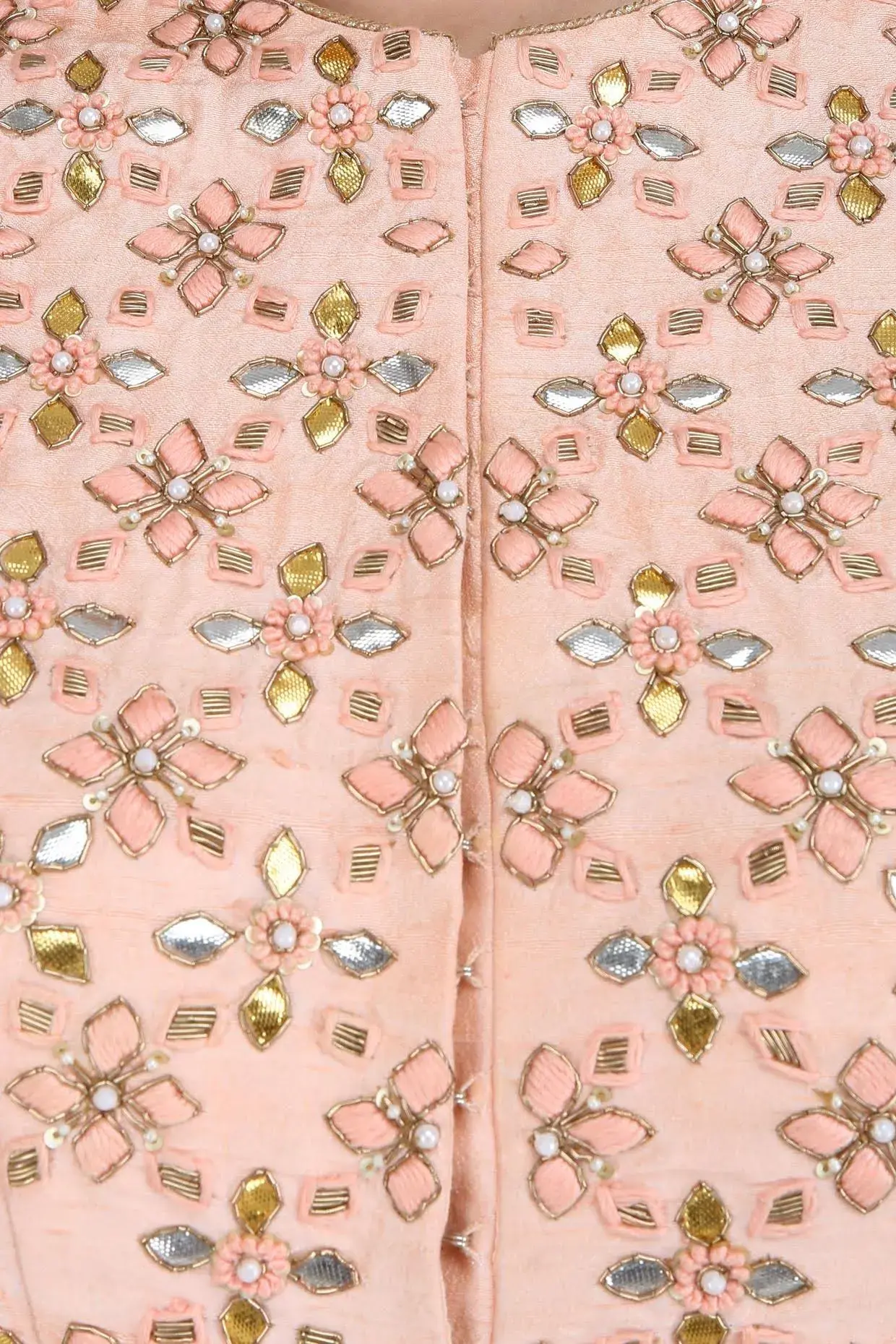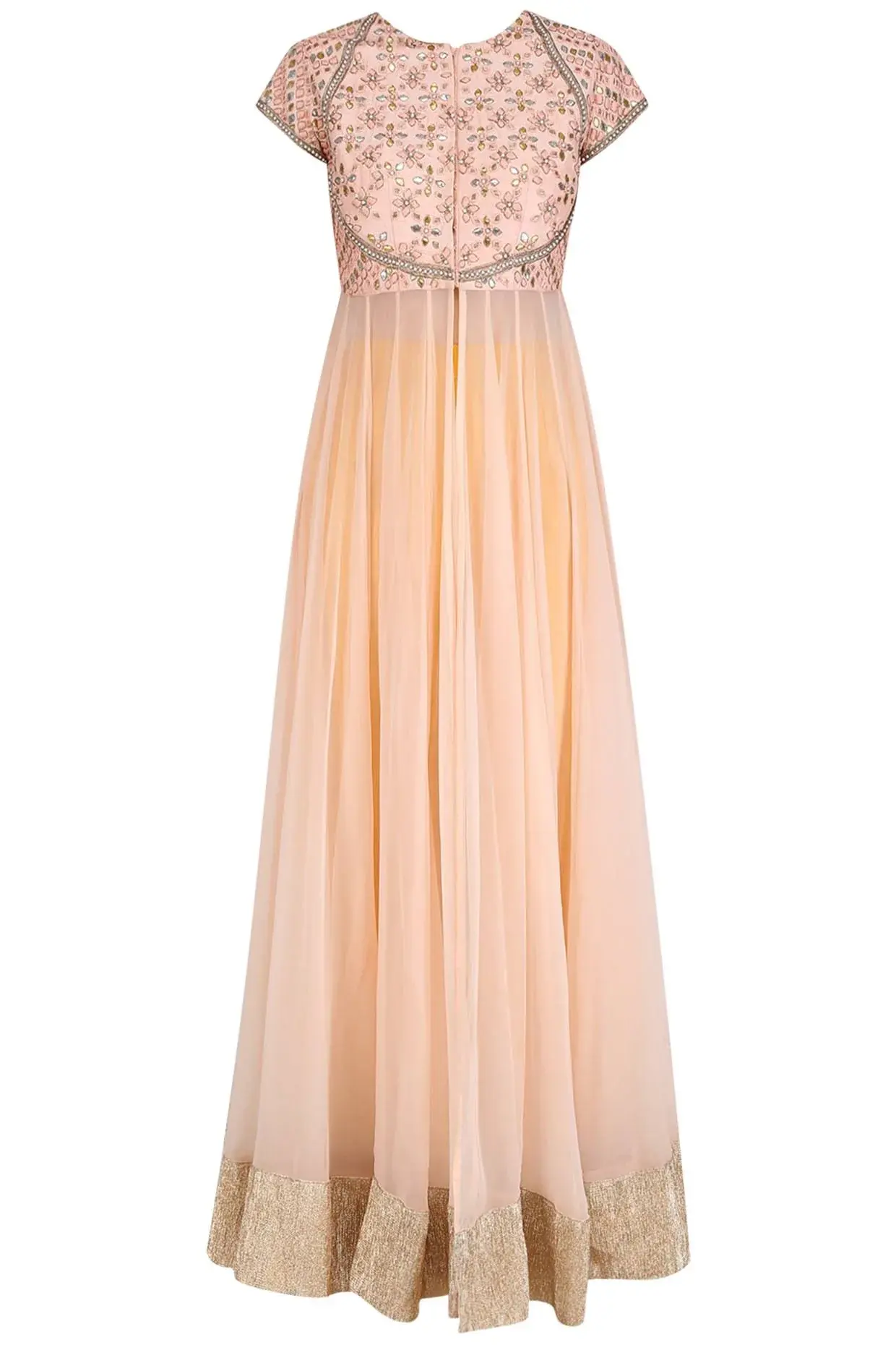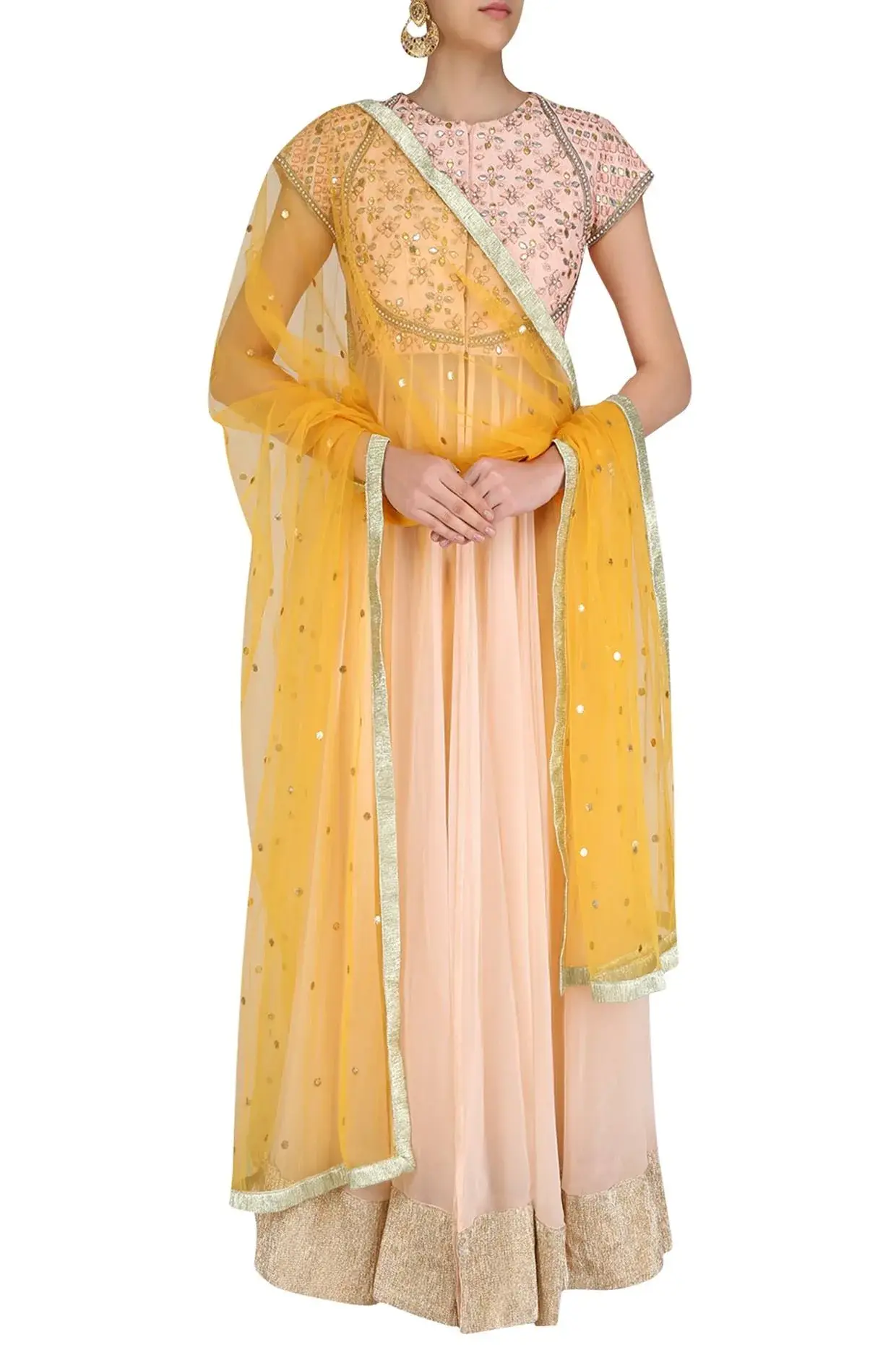 This Set Features A Light Peach Front Slit Flared Kalidaar Anarkali Kurta In Georgette Base With Gold Gota Patti Embroidery On The Front Yoke And Lace Border Around The Hem. It Comes Along With Yellow Embroidered Dupatta. Fit: Cut For Relaxed Fit. Composition: Georgette. Care: Dry Clean Only.