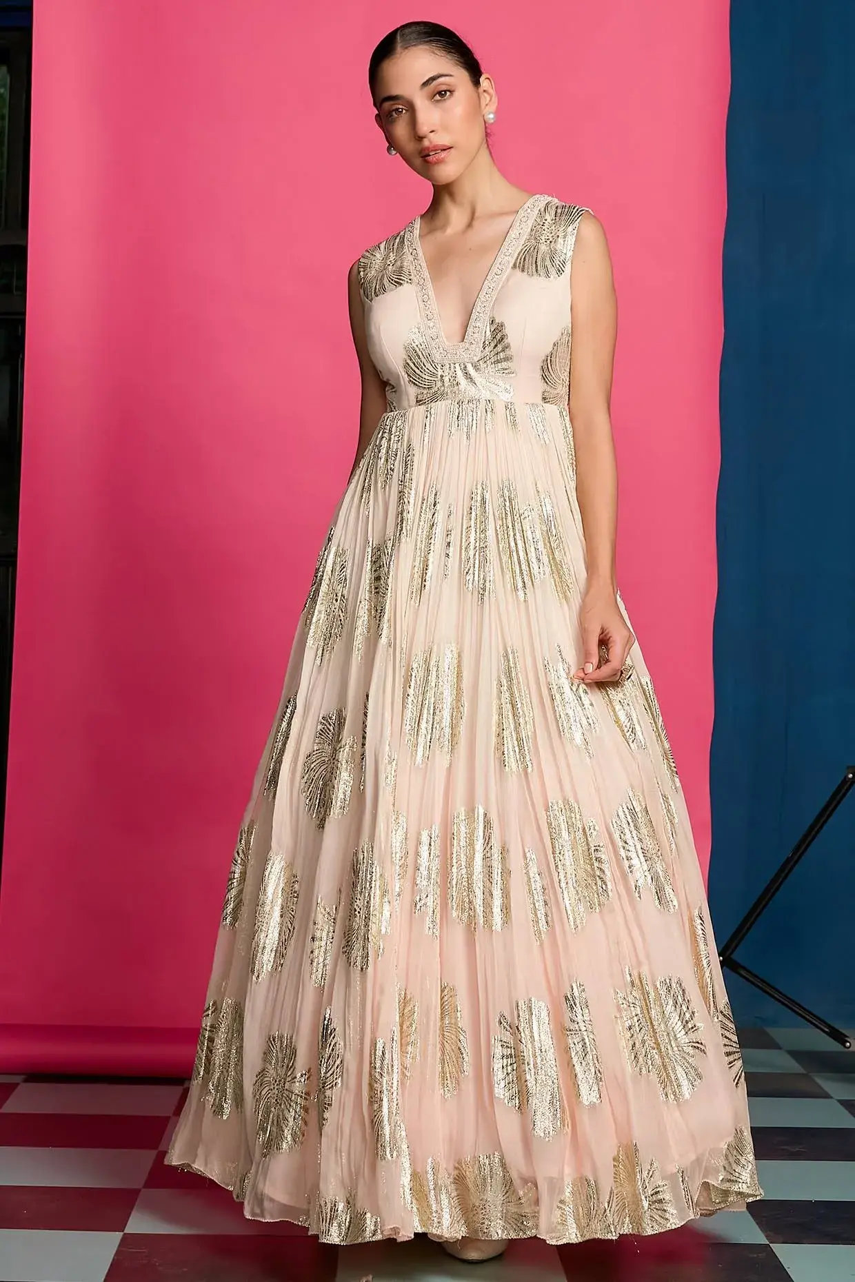 Featuring A Peach Anarkali In Shimmer Base. It Is Paired With An Embroidered Jacket. Accentuate With Statement Jewellery And Heels For Any Festive Occasion Or Sangeet Ceremony. Components: 2 (Anarkali, Jacket) Fit: Fitted At Bust. Composition: Shimmer. Care: Dry Clean Only.