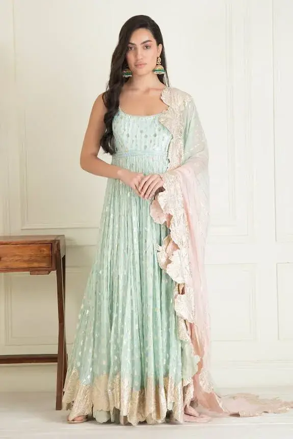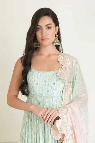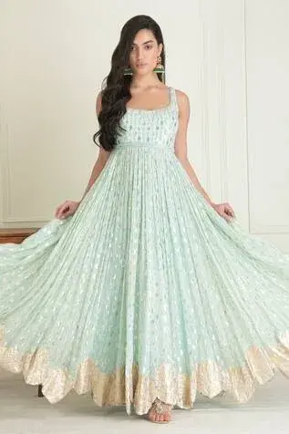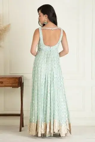 Powder blue sleeveless anarkali with sequin, bead embroidery in geometric pattern.