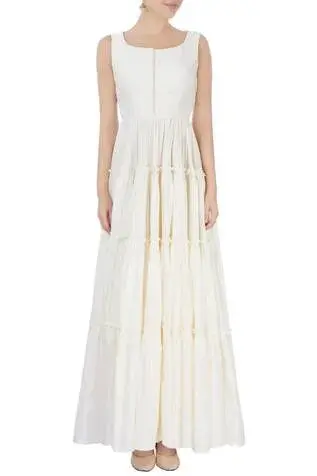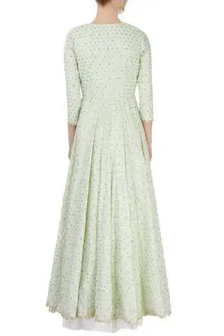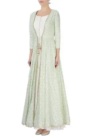 Mint green long jacket with embellished motifs. Comes with white tiered flared tunic. Components:2 Neckline: Wide Sleeve Length: Tunic: Sleeveless; Jacket: Three fourth Gather detail on dress Tiered maxi with ruffle detail Scalloped hemline on jacket Closure: Front tie-up tassel on jacket - Kanika's