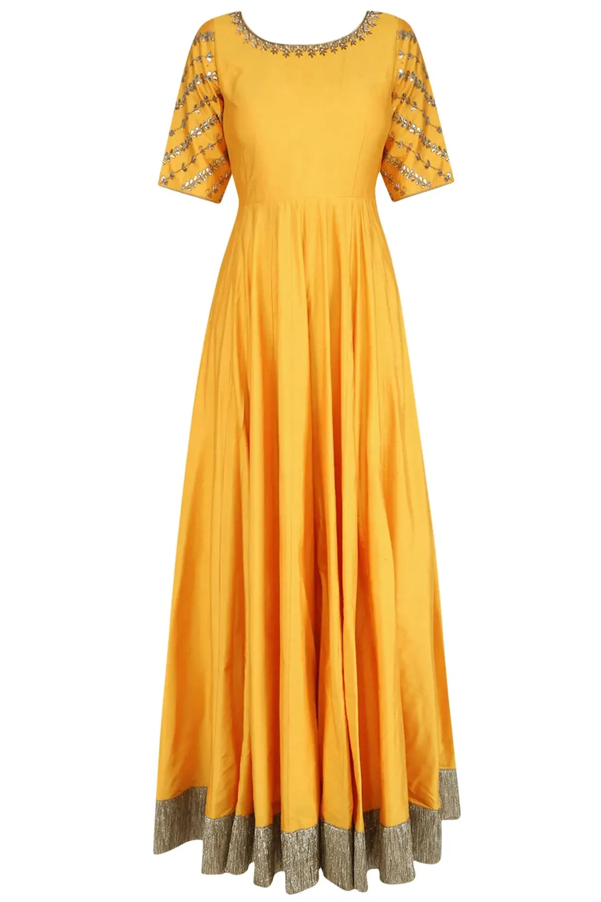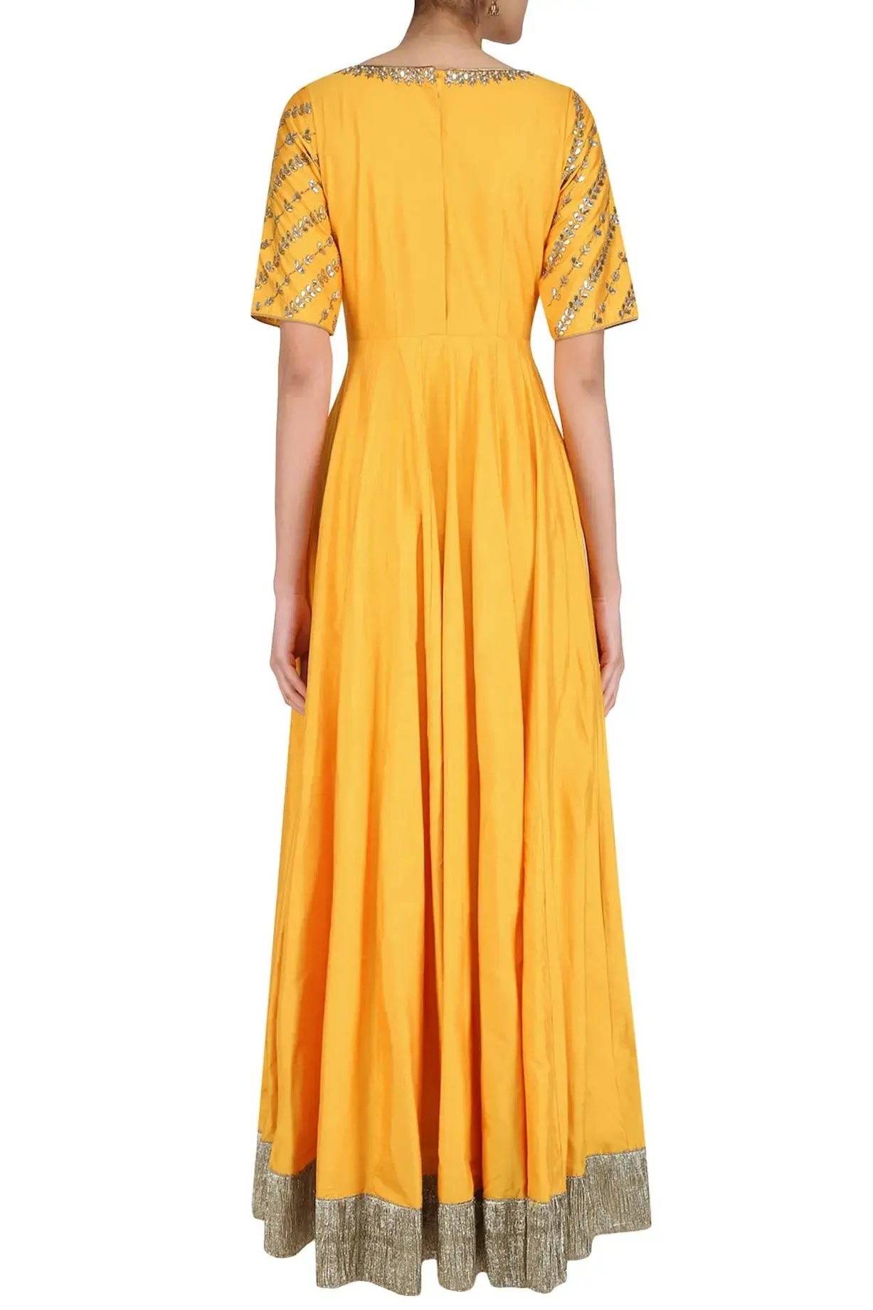This Set Features A Yellow Flared Kalidaar Anarkali Kurta In Cotton Silk Base With Gold Floral Gota Patti Embroidery On The Sleeves And Neckline. It Has Gold Wide Lace Border Around The Hem. It Is Paired With An Off White Net Dupatta With Floral Bootis Scattered All Over Along With Scaolloped Border At The Edges. Fit: Cut For Relaxed Fit....