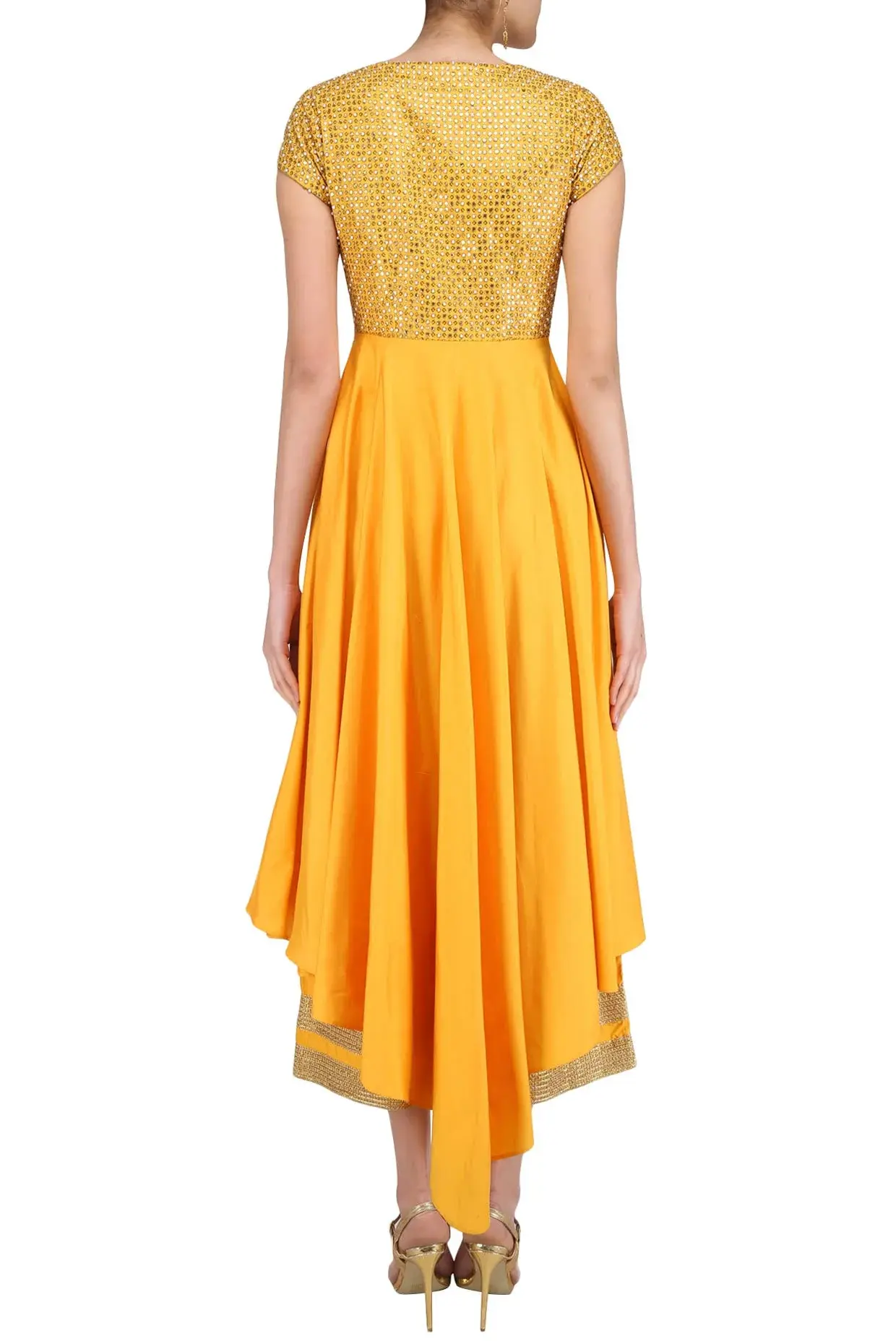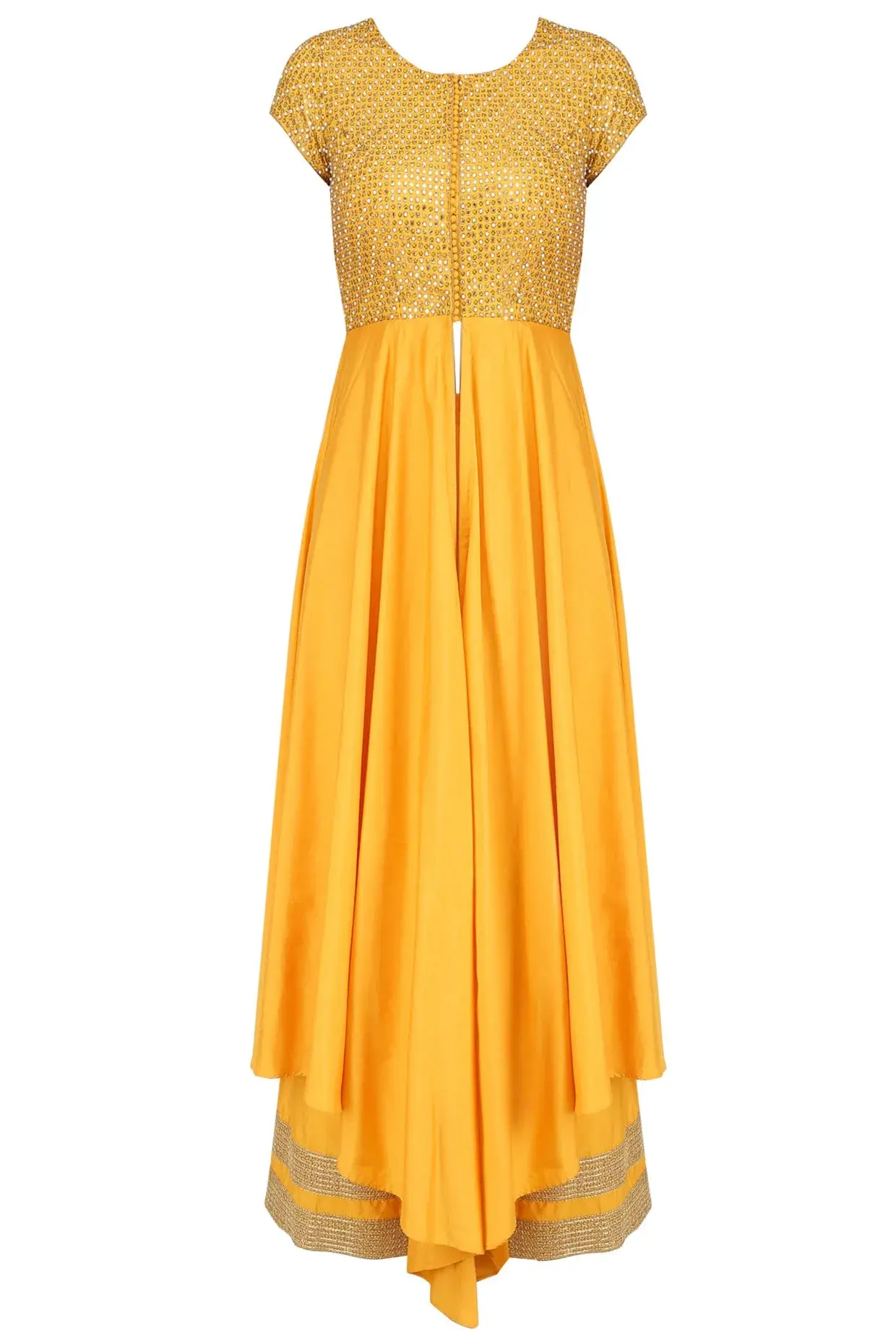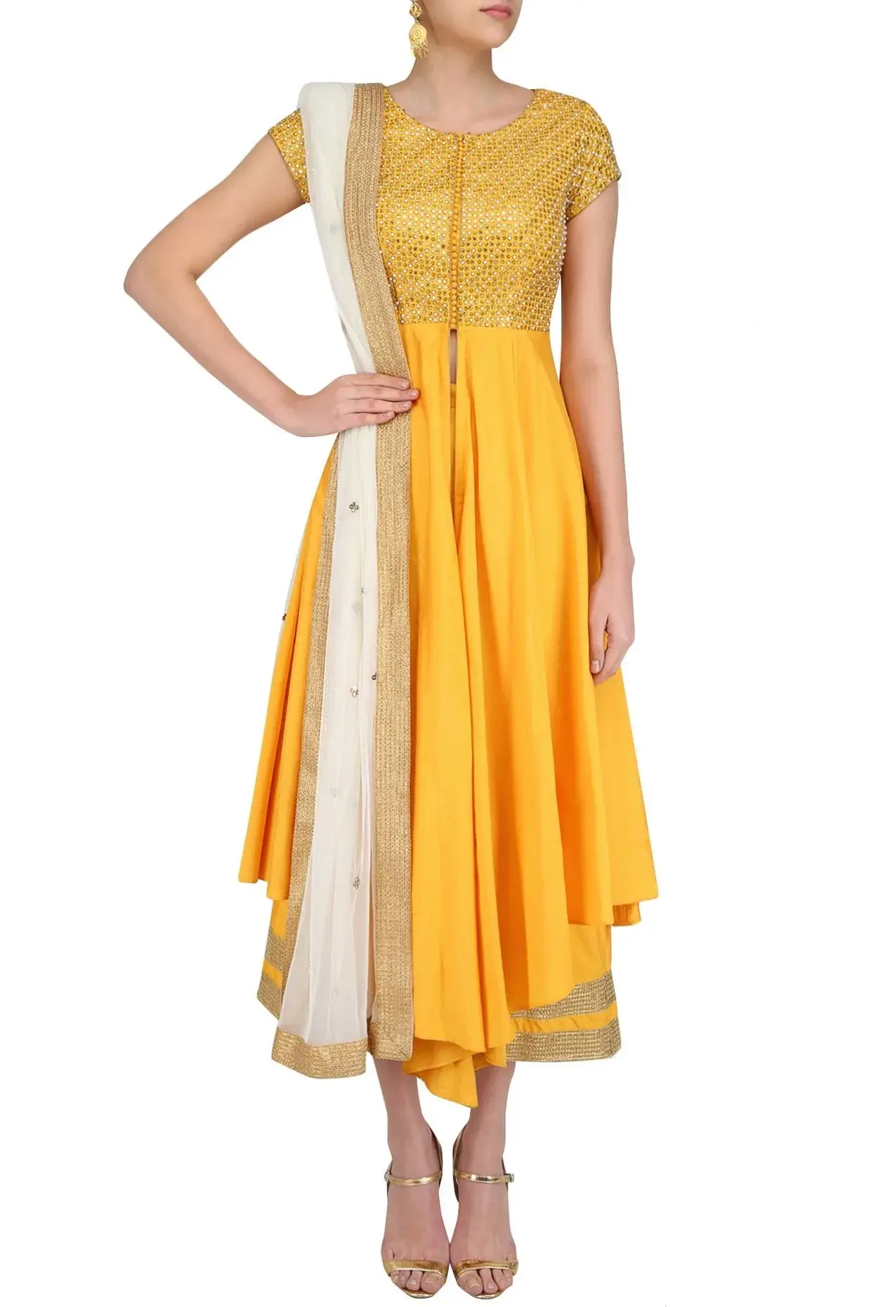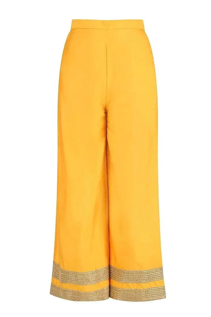 This Set Features A Yellow Front Slit Flared Kalidaar Anarkali In Cotton Silk Base With Gold Gota Patti Work On The Yoke. It Is Paired With Yellow Palazzo Pants With Gold Striped Border Gota Patti Panels. It Is Paired With An Off White Net Embroidered Dupatta. Fit: Cut For Relaxed Fit. Composition: Cotton Silk, Net. Care: Dry Clean Only.