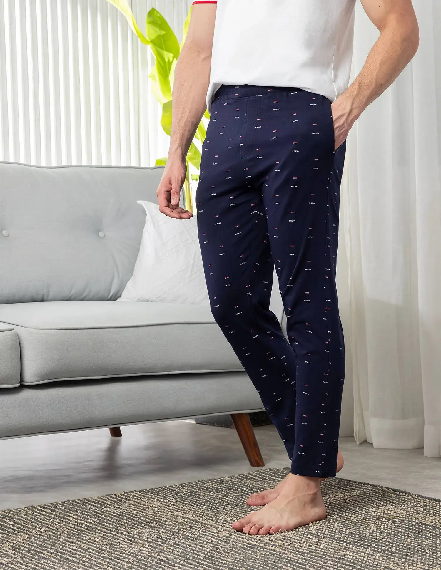 Bring a sophisticated look to your loungewear with these comfortable printed blue pyjama from U.S. It is made from finest quality which is soft and comfortable. It features slim fit, trouser style pyjama.
