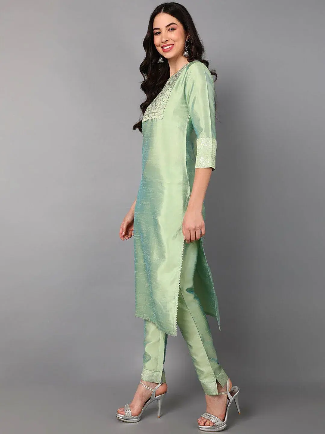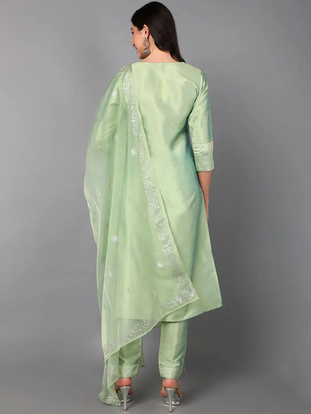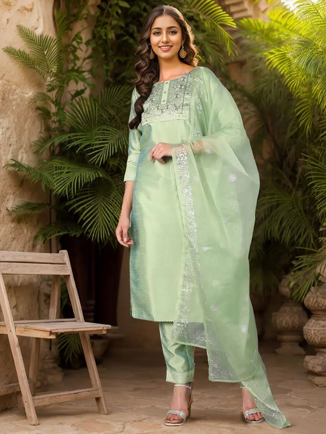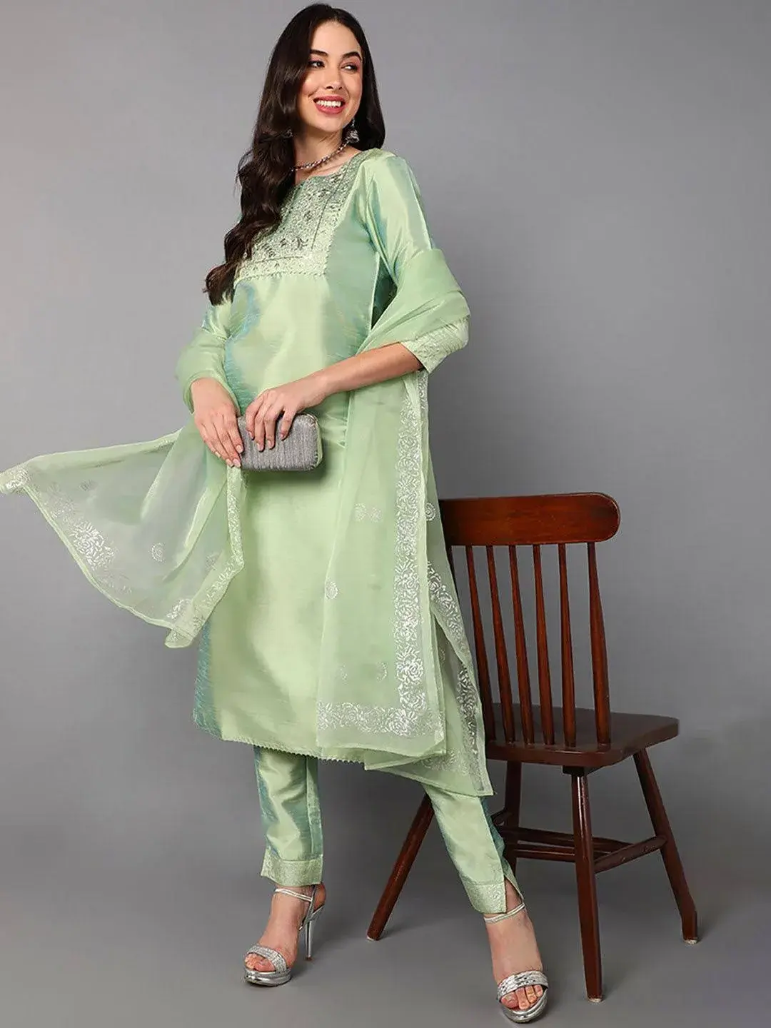 Green & silver toned embroidered Kurta with Trousers with dupatta Kurta design: Ethnic motifs embroidered Straight shape Regular style Round neck, three-quarter regular sleeves 1 pockets sequinned detail Calf length length with straight hem Poly silk machine weave fabric Trousers design: Solid Trousers Partially elasticated waistband Drawstring closure Dupatta design: Printed