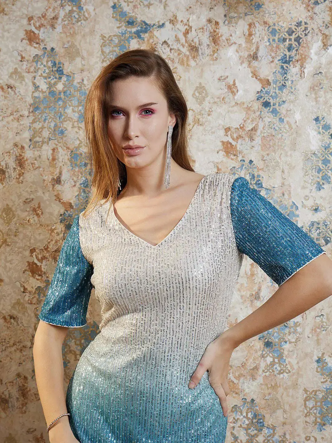 Beige and blue embellished a-line dress V-neck Short, regular sleeves Sequinned detail Mini length in straight hem