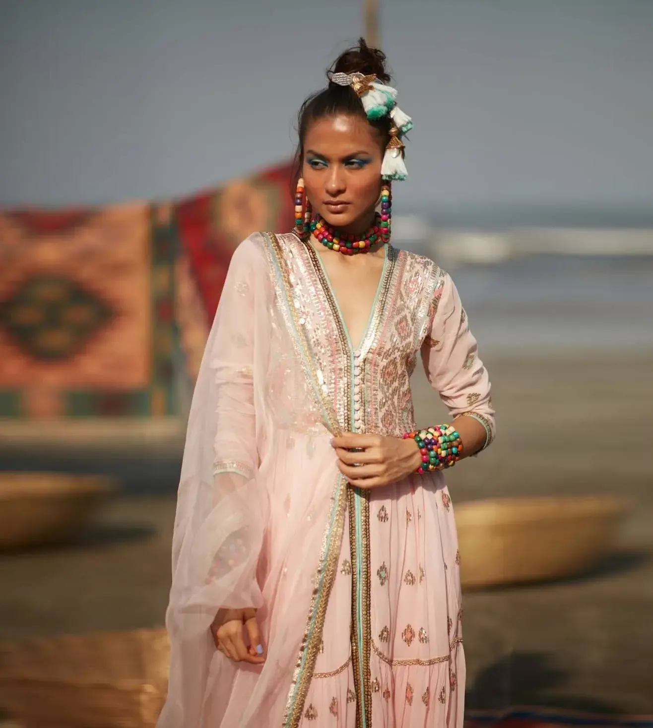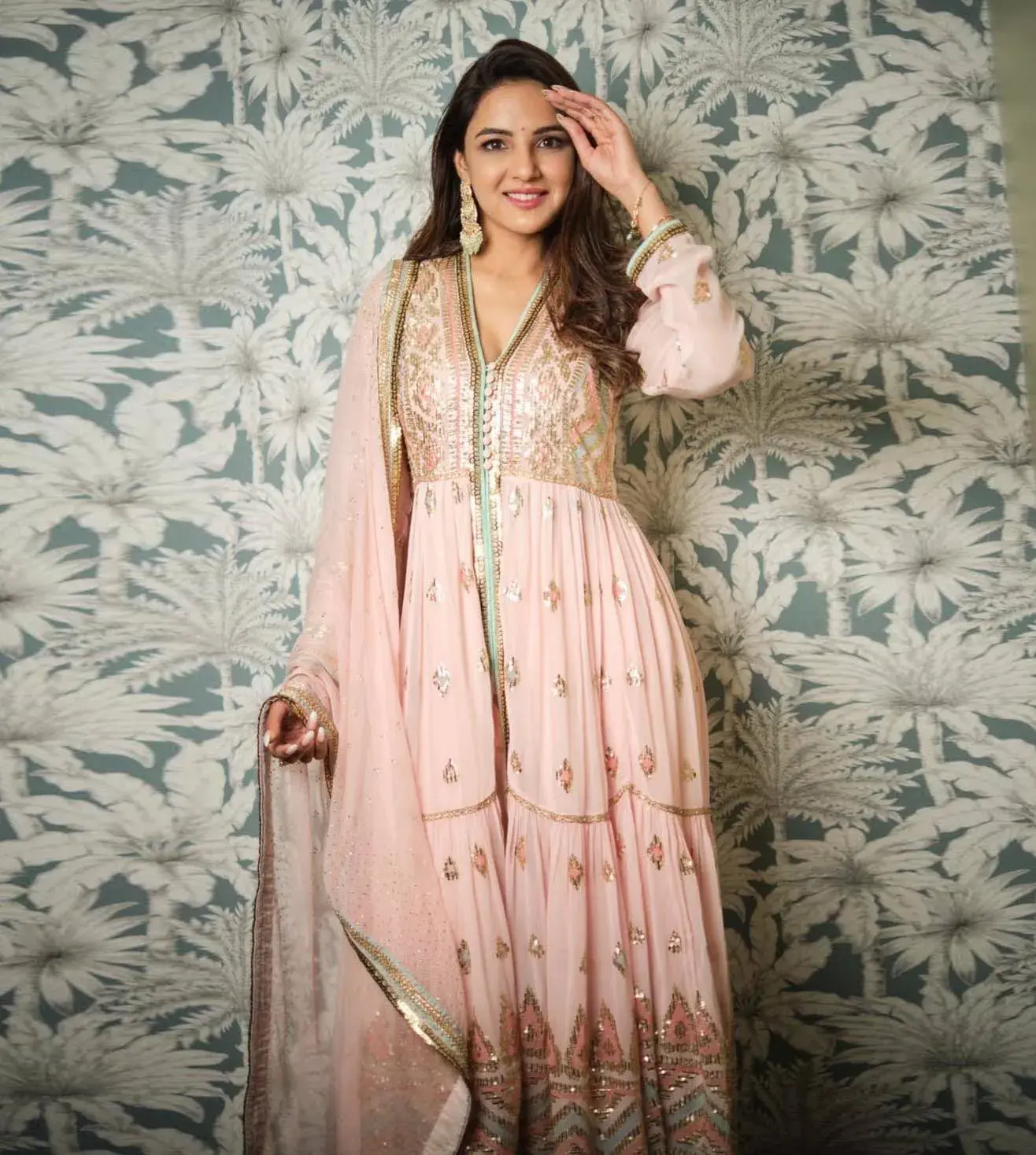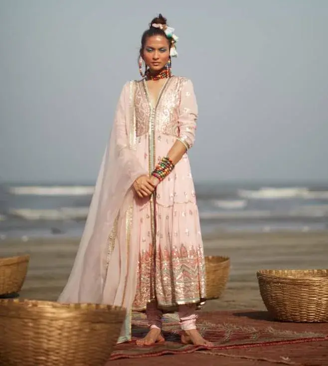 Redefine your charming look with this anarkali set. The tiered anarkali is here to stay for quite long. You will never wonder if it's okay to bring it along, they are always welcomed. The chudidar has been put together with three sequin dupatta. The anarkali has been made using georgette, churidar has been made using lycra while dupatta is net....