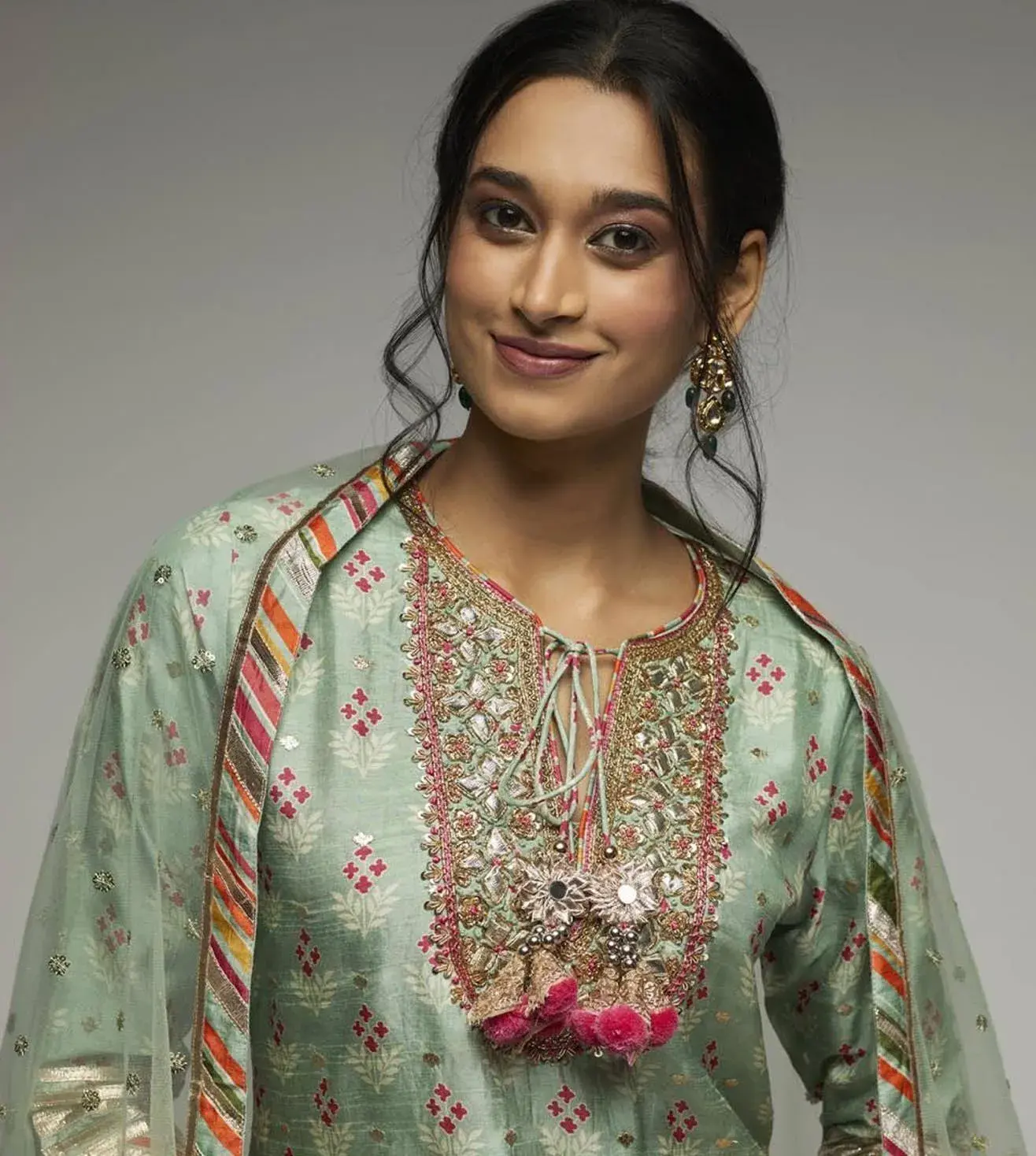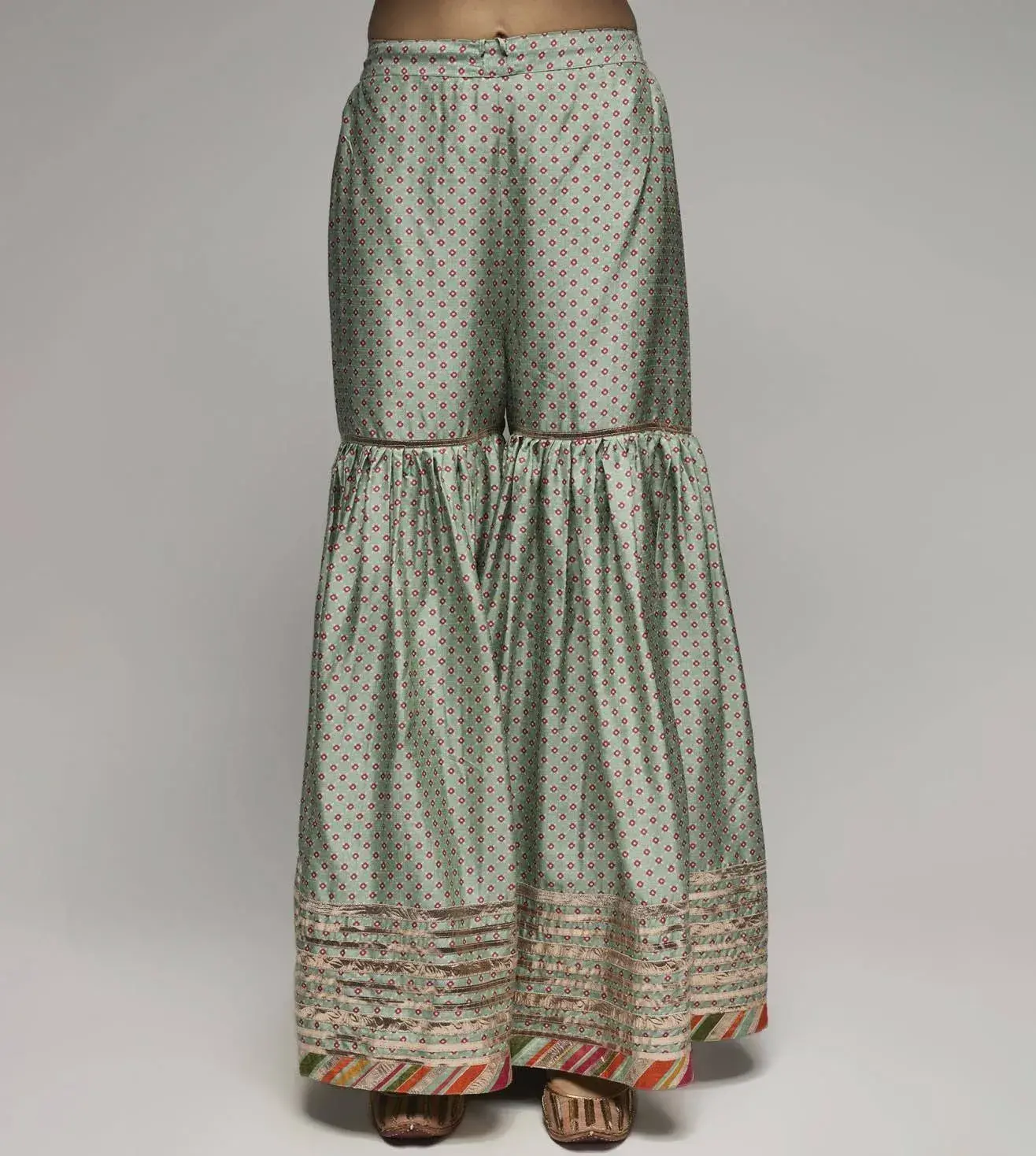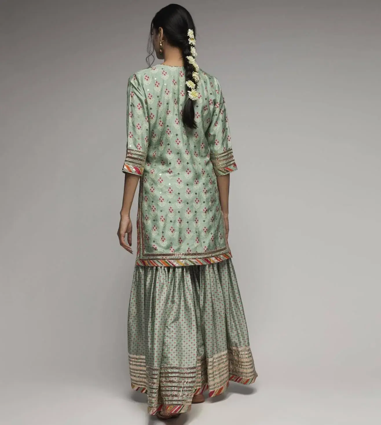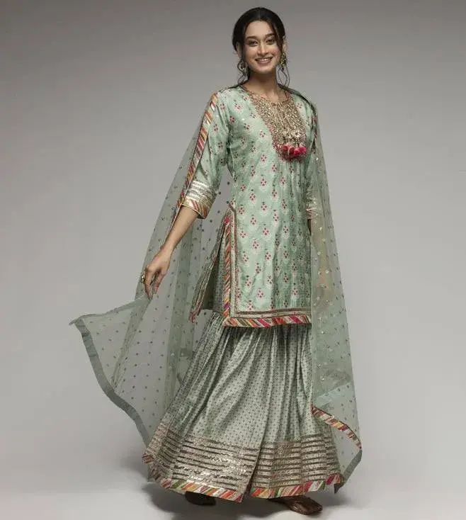 Hit the roads in style by wearing this garara set. In a sophisticated toned-down hue, the embroidered short kurta with garara and dupatta will add shimmer and richness to your look. The dupatta is made using net tikki whereas the kurta and sharara are tussar silk. Disclaimer: Product colour may slightly vary due to photographic lighting sources. Country of Origin...