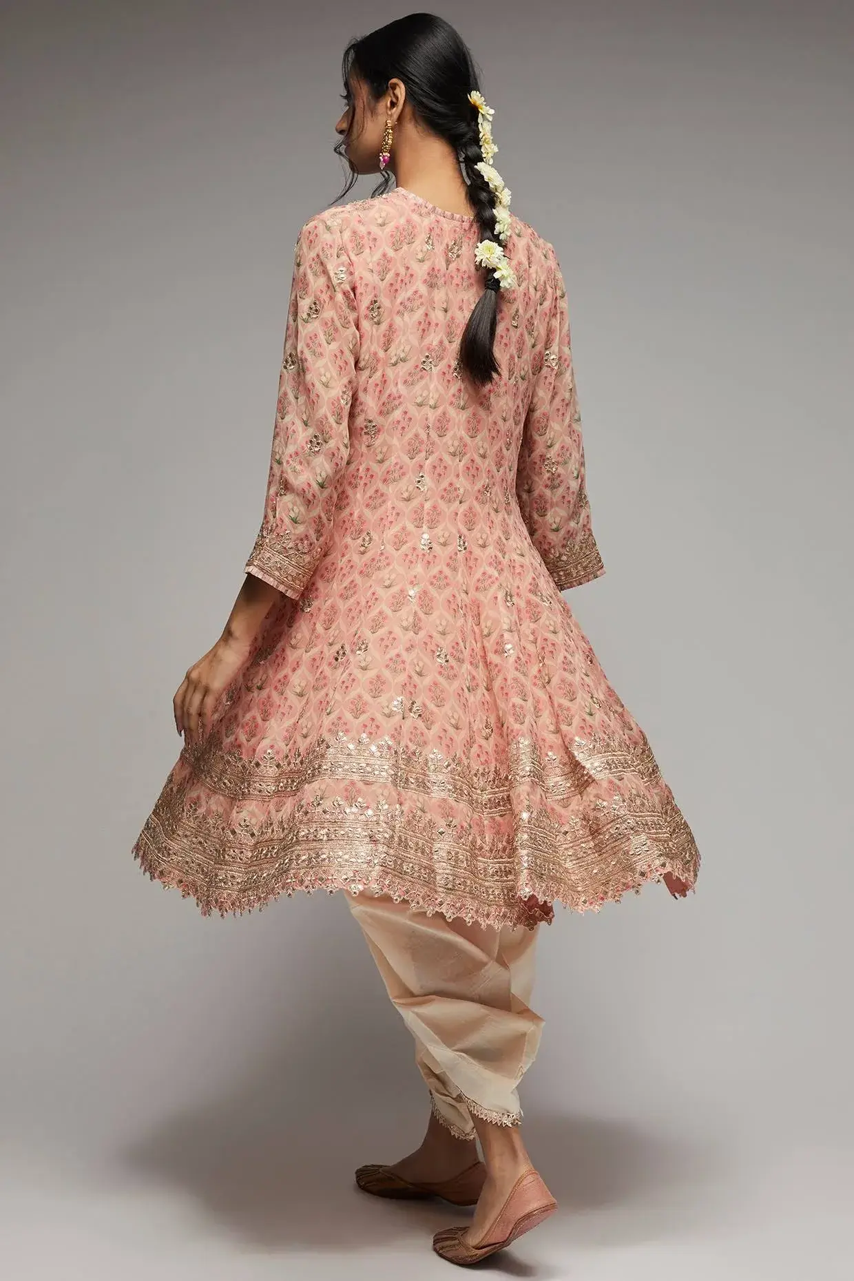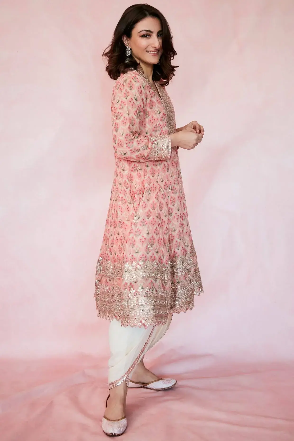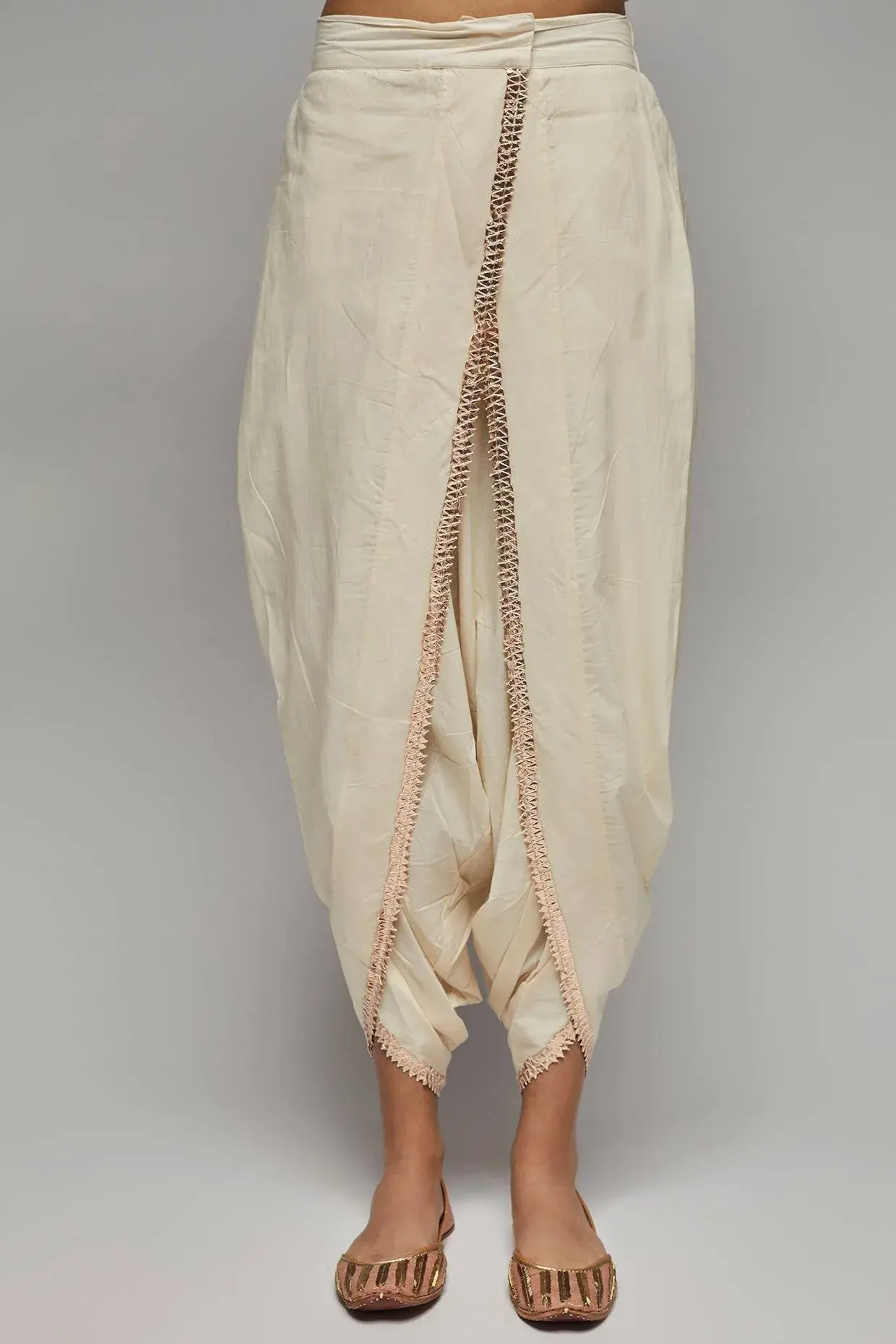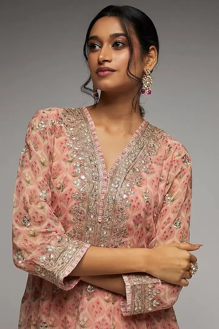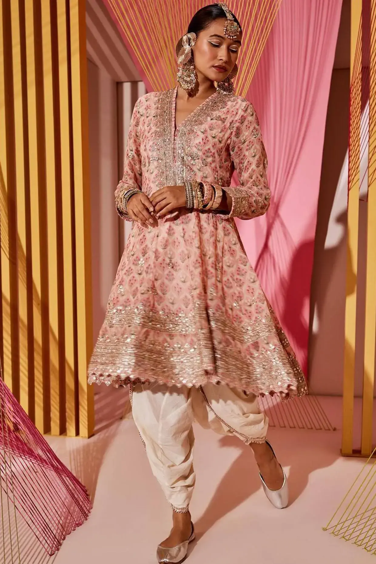 Featuring A Blush Pink Tunic In Georgette Base With Embroidery. It Is Paired With Contrasting Ivory Cotton Dhoti Pants. Fit: Fitted At Bust And Waist. Composition: Georgette, Cotton. Care: Dry Clean Only.