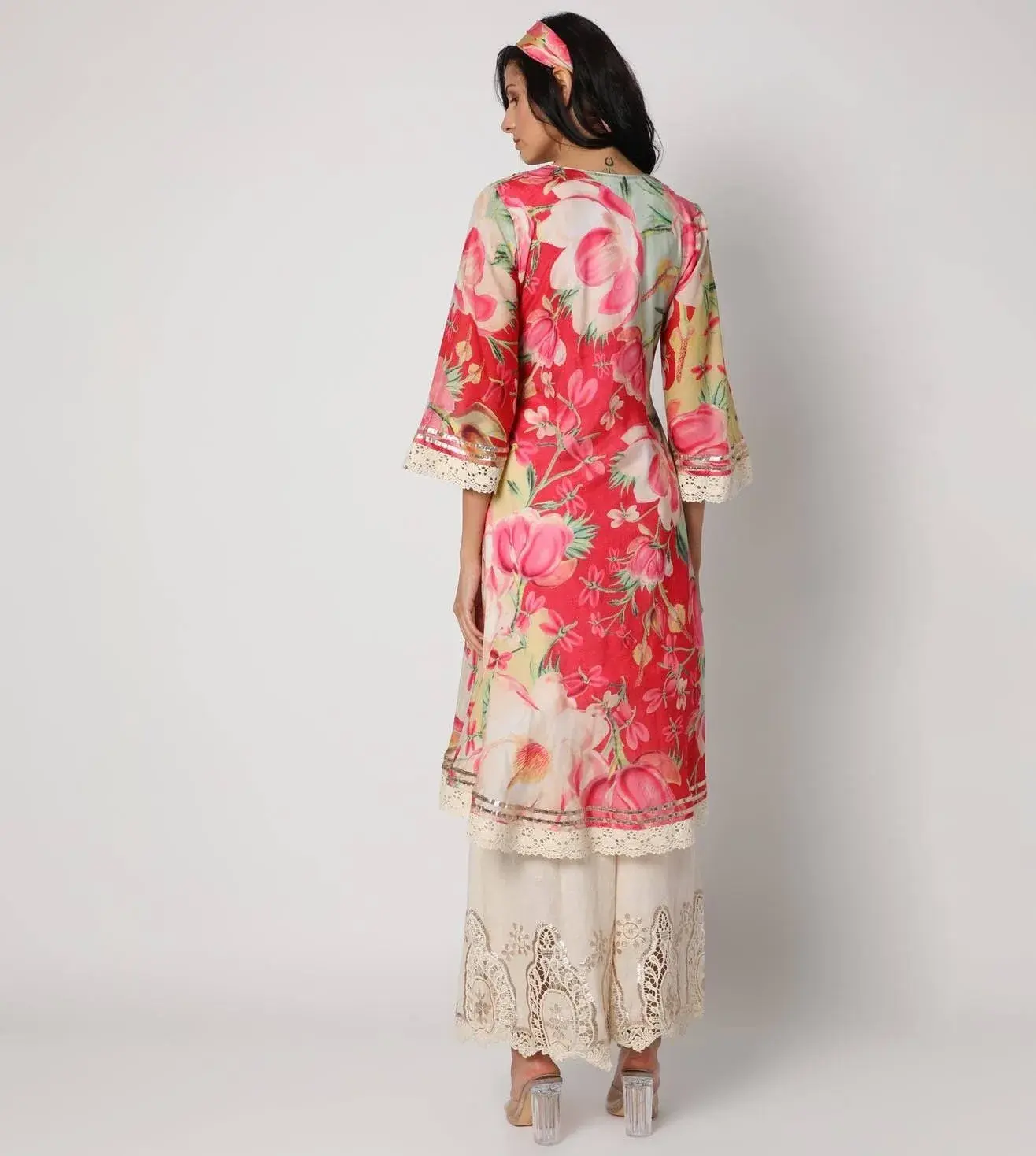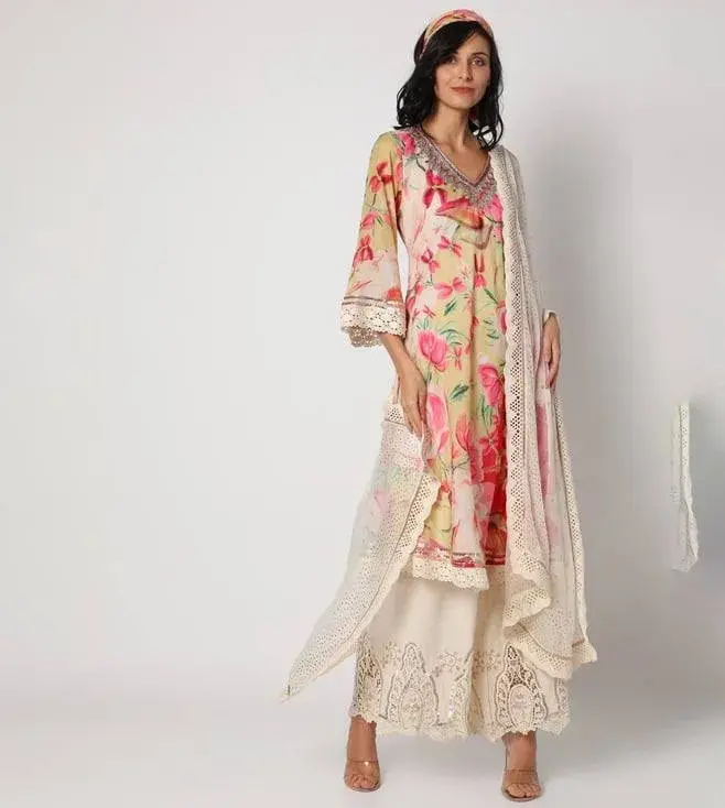 Intrigue one and all with this flared tunic set from the Khushi collection, that will add a dash of extra charm to your look. Using bold vibrant ochre base print, the flared A-line tunic is embroidered with gota and threadwork. The cutwork palazzo and badla dupatta has gota highlights and lace trims. The tunic is made using cotton silk, palazzo...