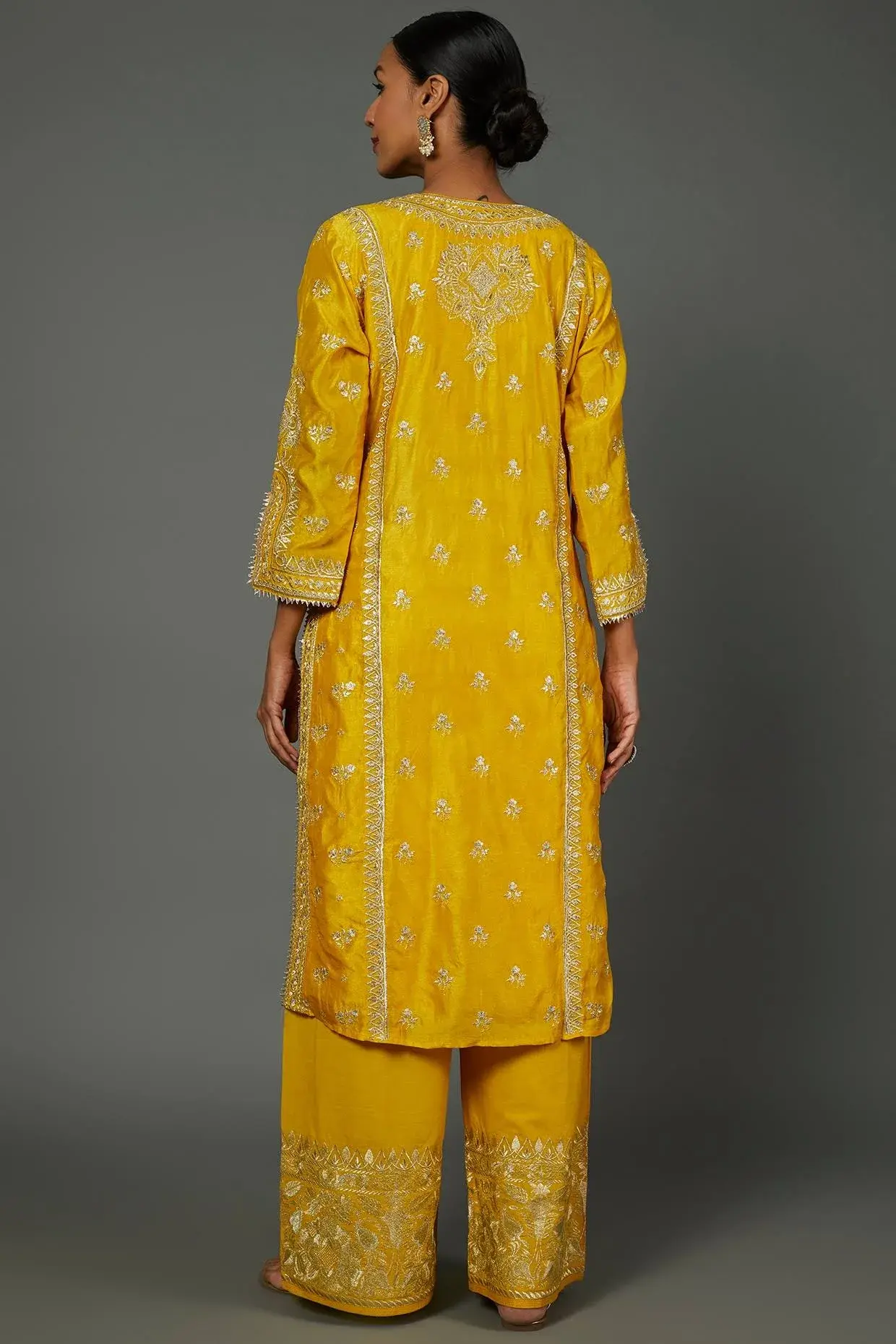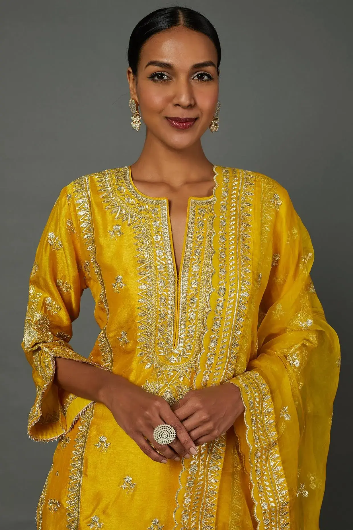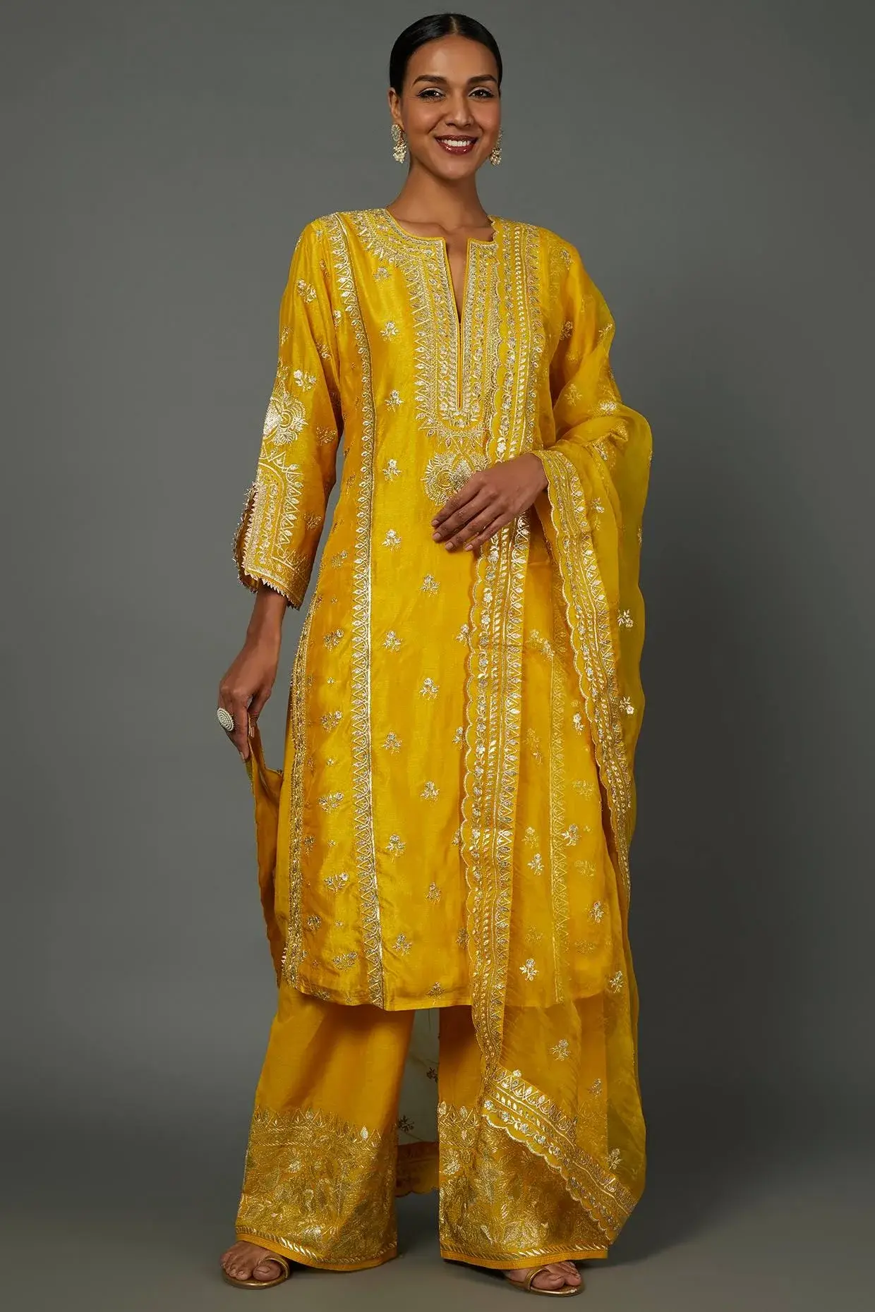 Featuring A Line Kurta In Cotton Silk Base With Embroidery. It Is Paired With Matching Cotton Embroidered Palazzo Pants And An Organza Dupatta. Fit: Fitted At Bust And Waist. Composition: Cotton Silk, Cotton, Organza. Care: Dry Clean Only.