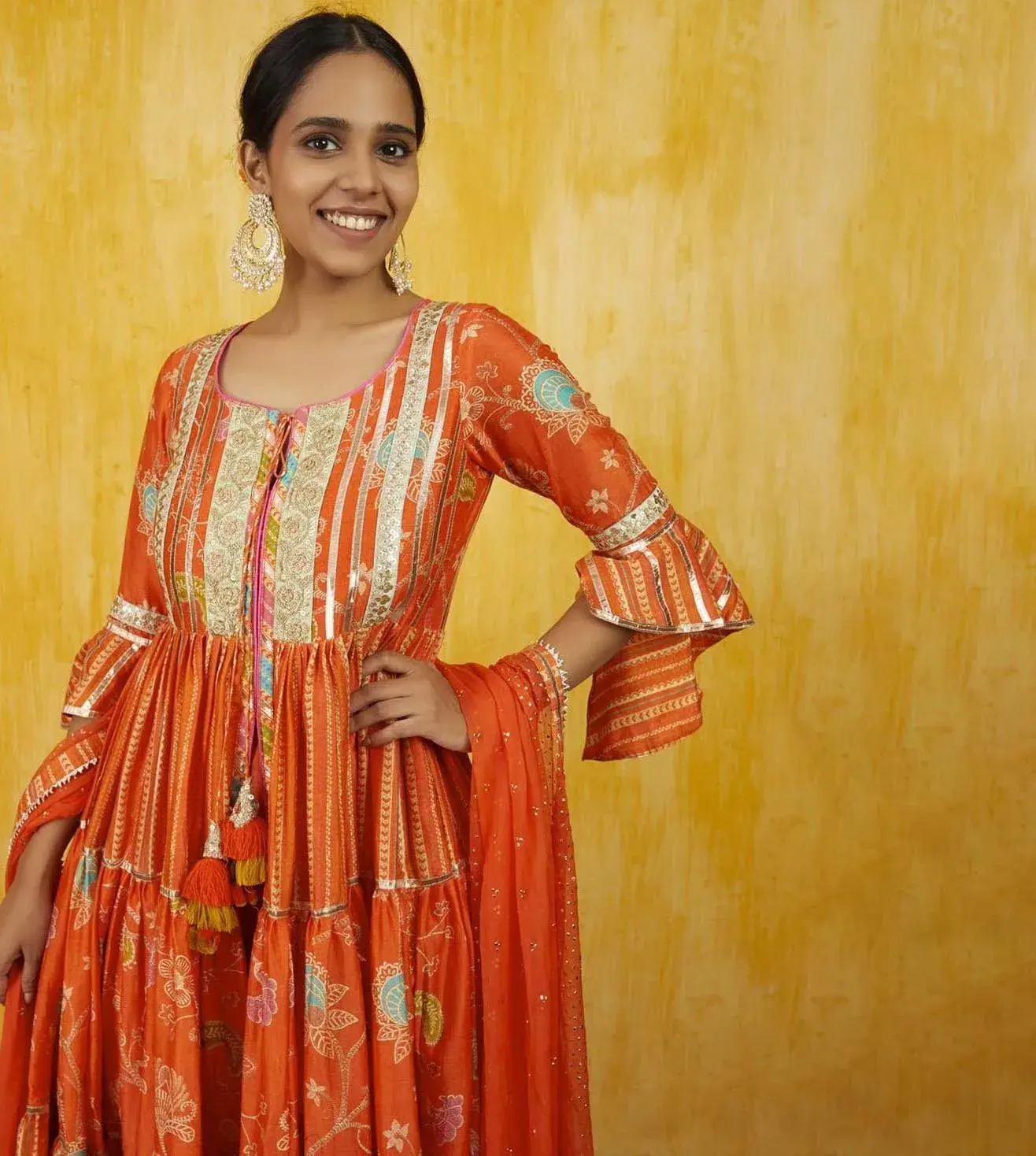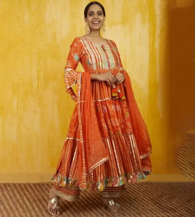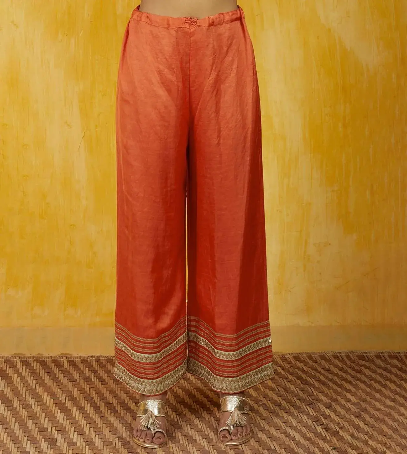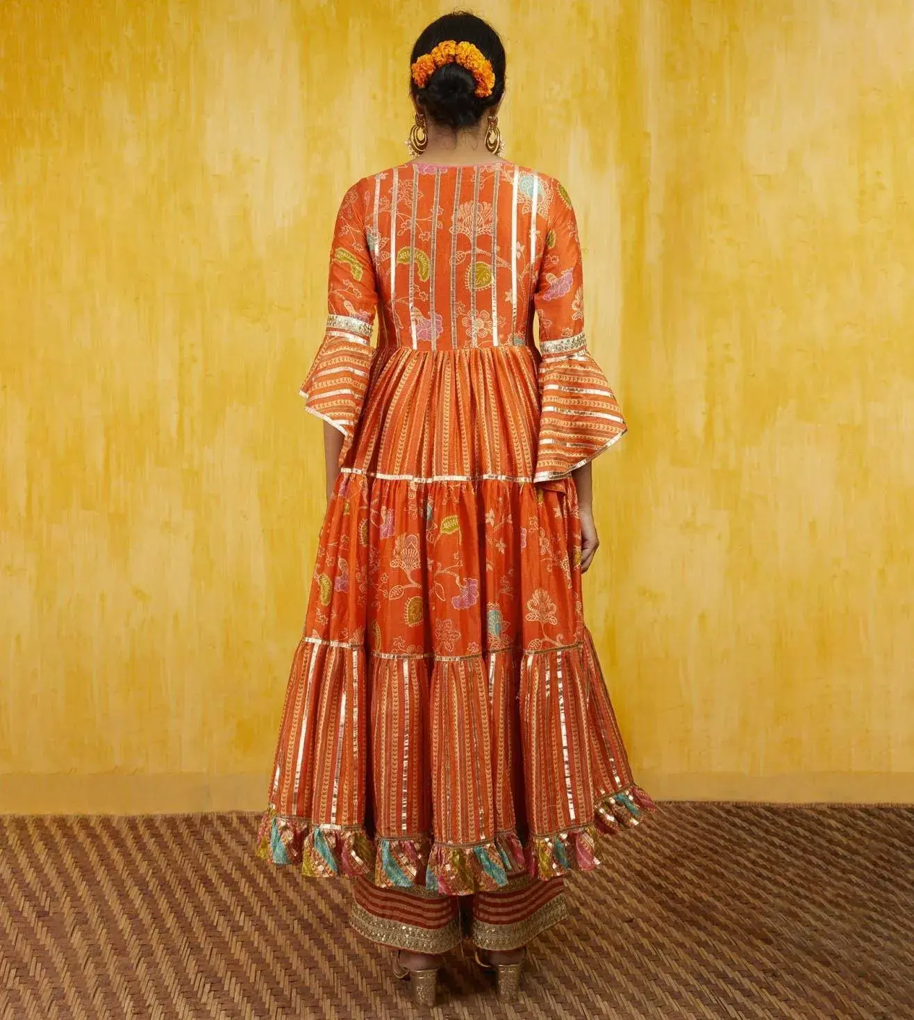 This Marigold Garden set includes a floral and layered cotton silk tunic that has elaborate embroidery using gota and borders. The gathers at the yolk give softness and flow to the outfit. The linen satin palazzo and chiffon badla dupatta complete the ensemble. Disclaimer: Product colour may slightly vary due to photographic lighting sources. Country Of Origin - India.