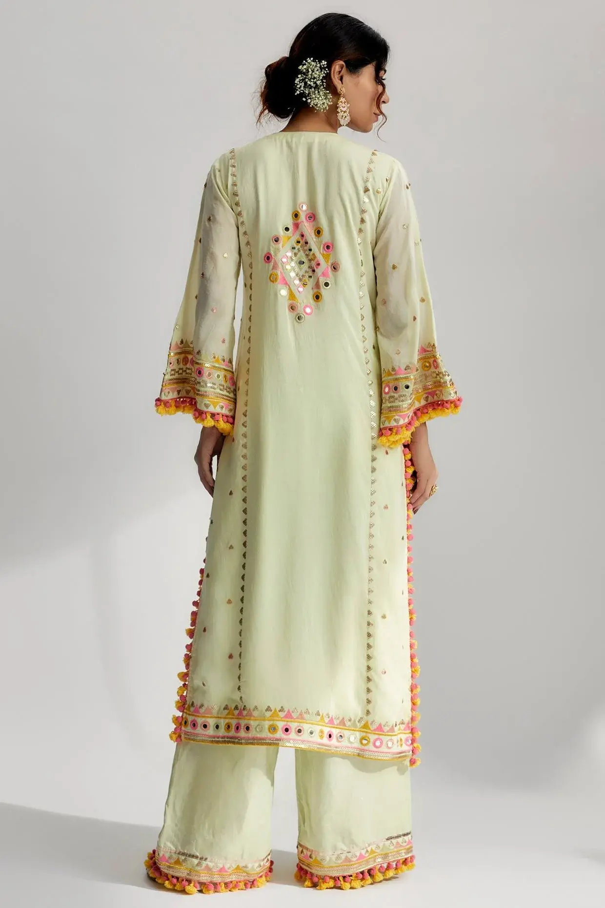 Featuring A Mint Long Kurta In Viscose Base With Mirror Hand And Machine Embroidery, Including Tassels. It Is Paired With Linen Satin Palazzo Pants And A Chiffon Dupatta. This Ensemble Is Perfect For Celebratory Occasions, Cultural Events, Or Any Festive Gathering Where You Want To Make A Lasting Impression. Components: 3 Fit: Fitted At Bust And Waist. Composition: Viscose, Linen...