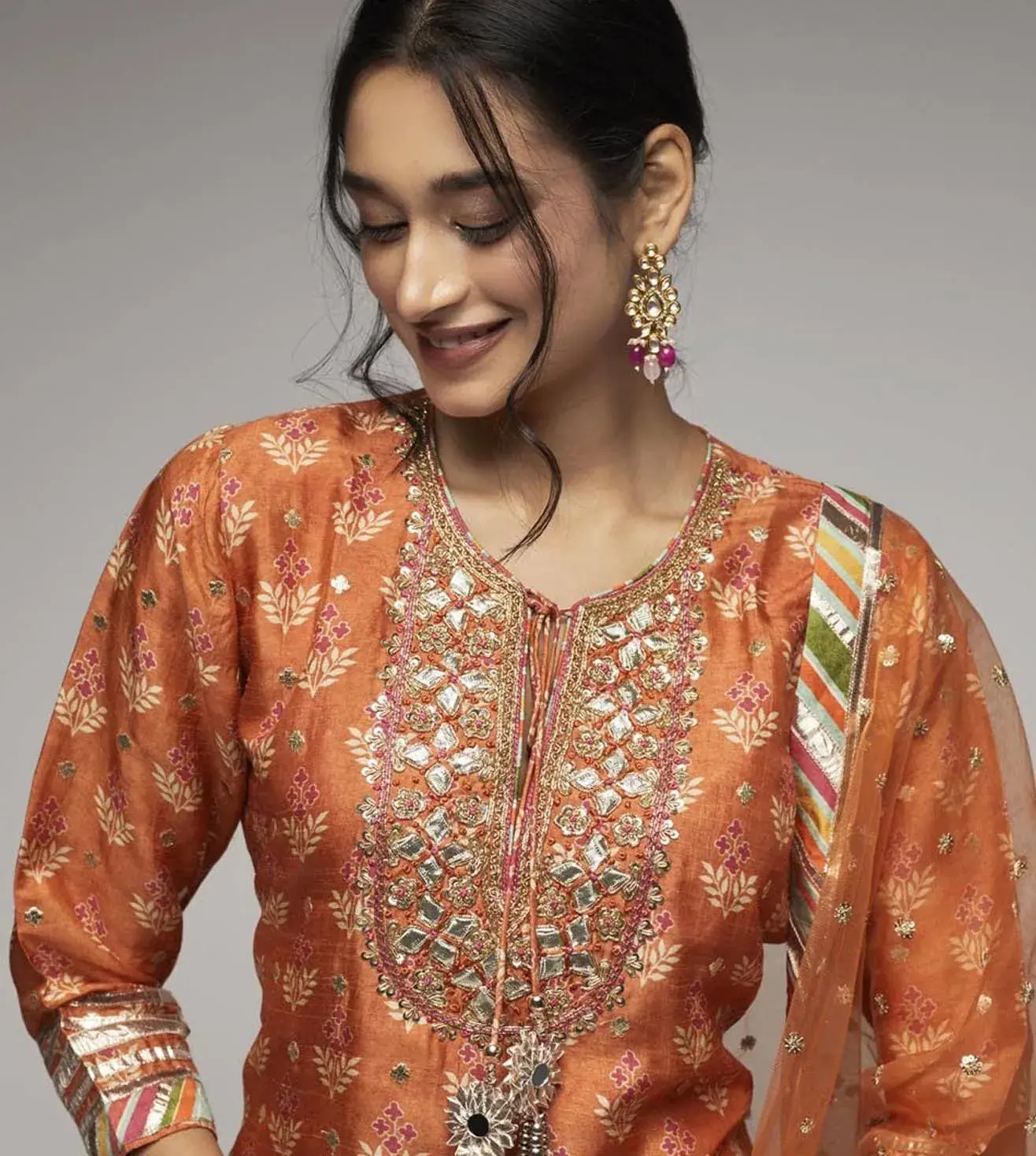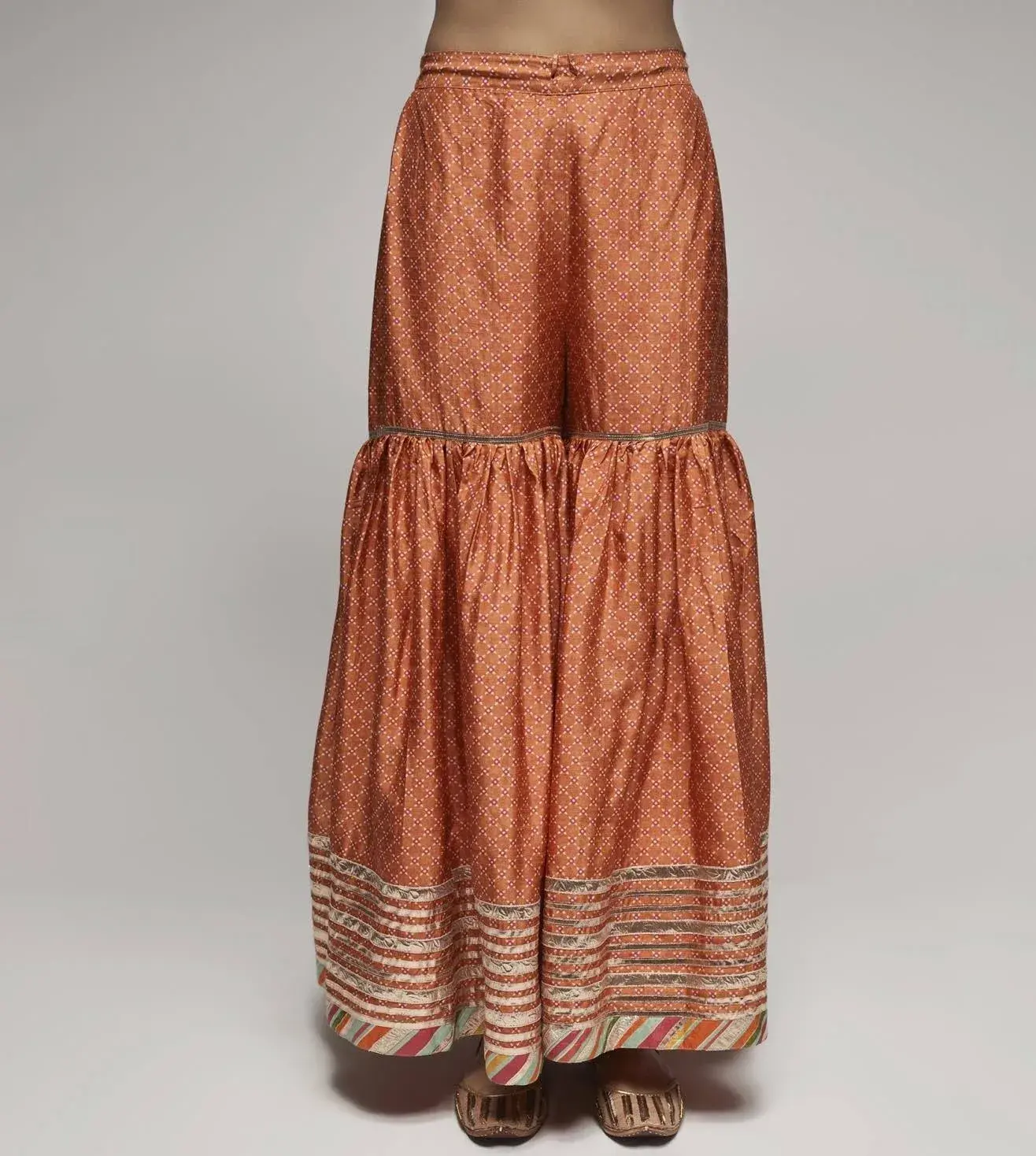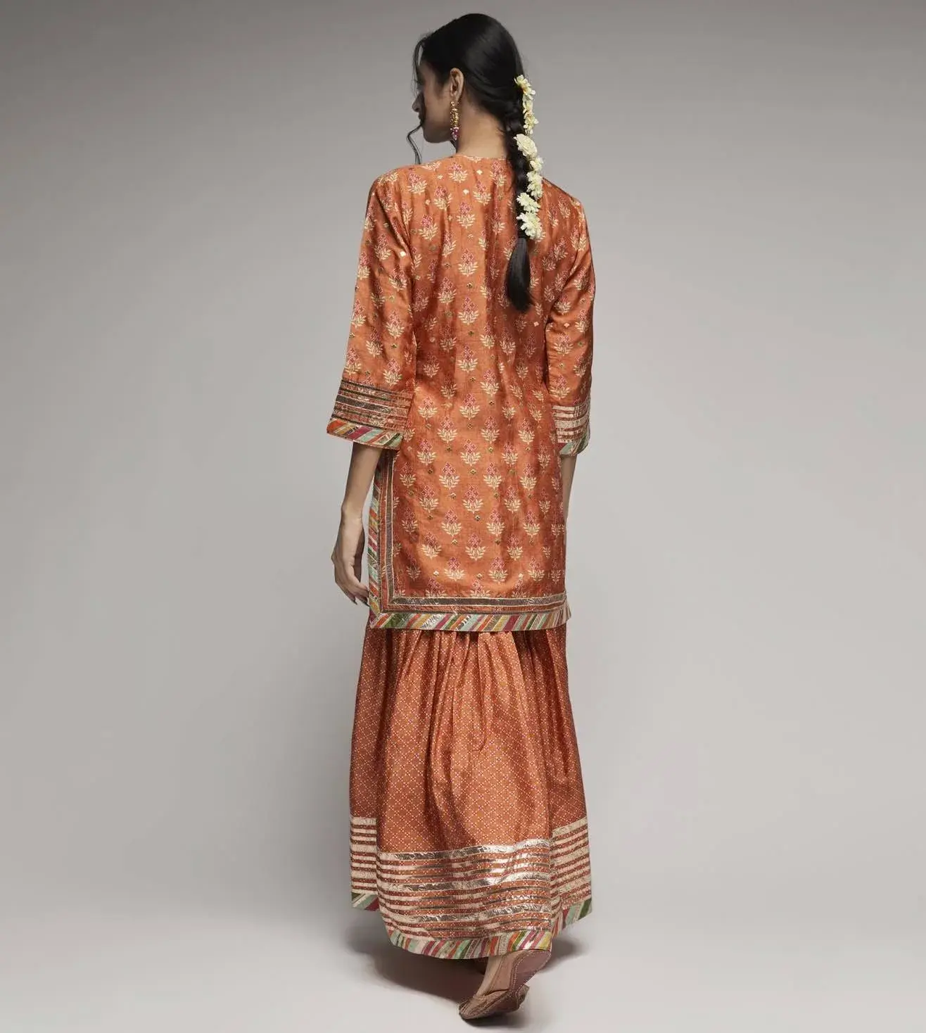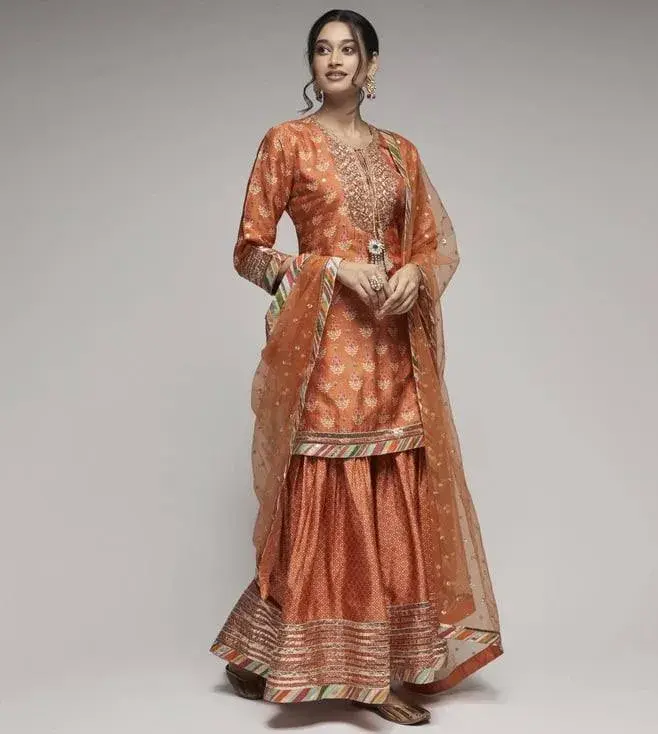 Revamp your wardrobe with this garara set. This ensemble is styled to have flow and flounce. The short tunic with dupatta are embroidered in sequins and thread. The voluminous sharara adds feminine grace to the set. The dupatta is made using net tikki whereas the kurta and sharara are tussar silk. Disclaimer: Product colour may slightly vary due to photographic...