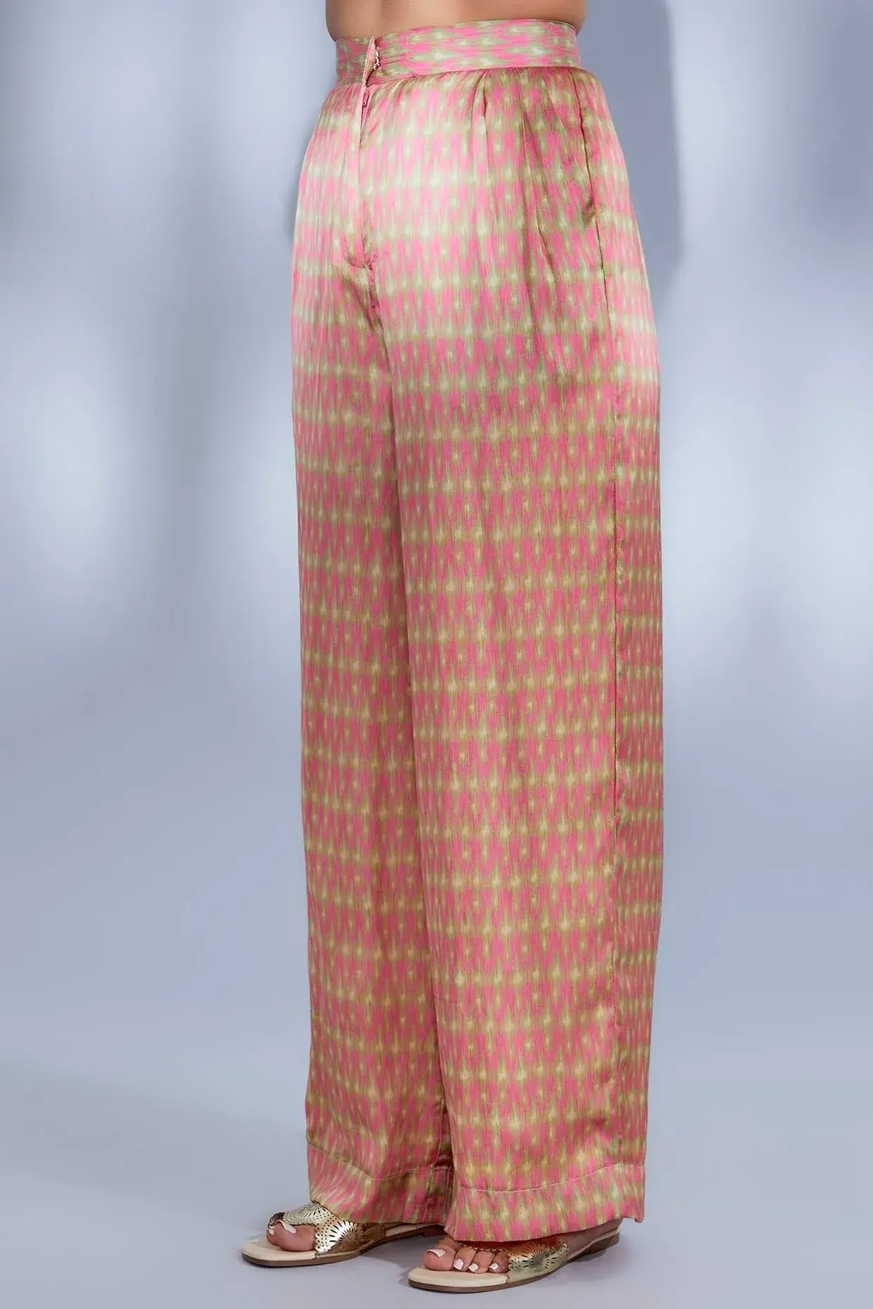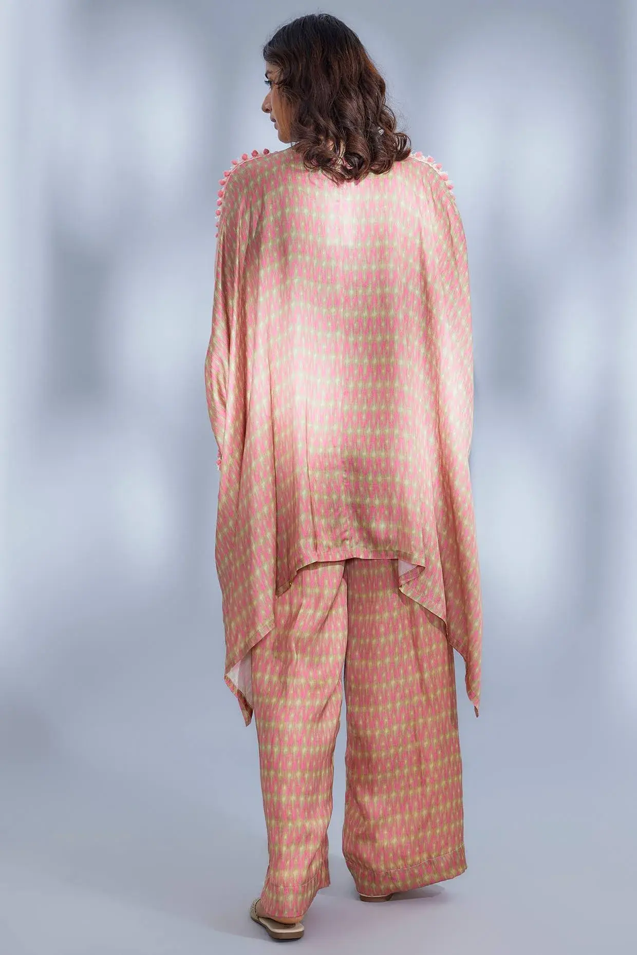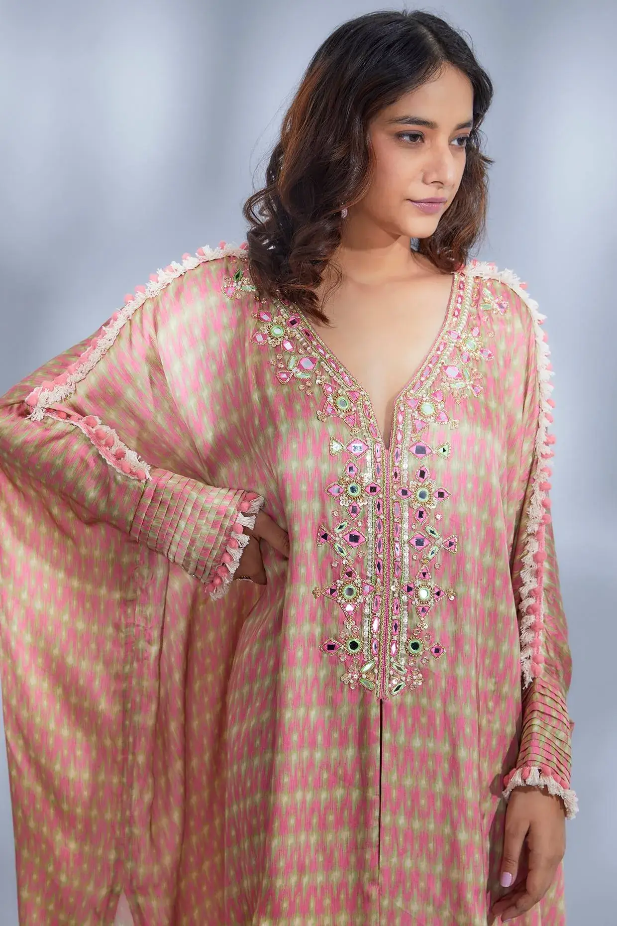 Featuring A Pink Kurta In Satin Base With Print, Fringes, Tassels, And Mirror Hand Embroidery. It Is Paired With Matching Pants. Components: 2 Fit: Fitted At Bust And Waist. Composition: Satin. Care: Dry Clean Only.