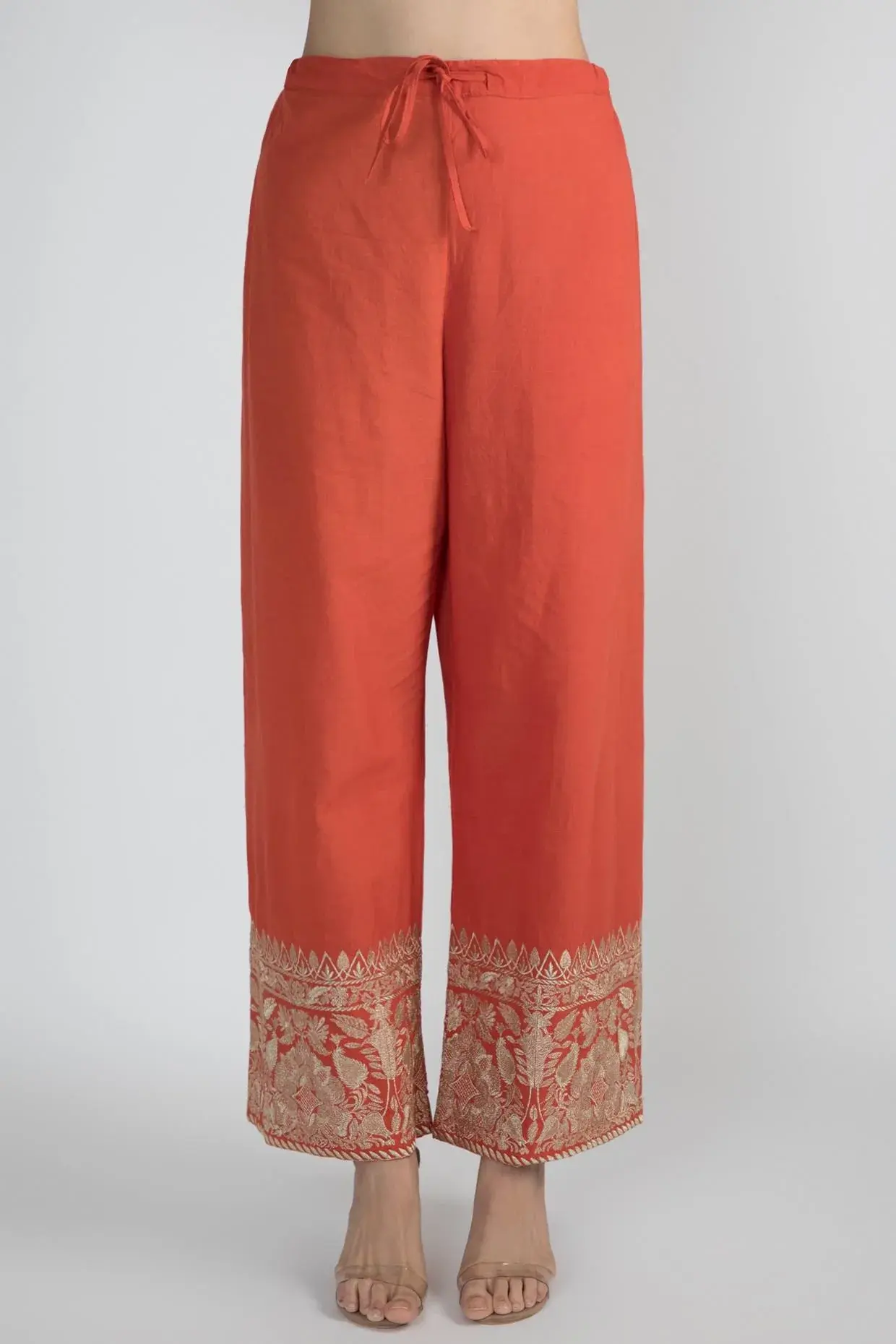 Featuring A Red Jacket Style Tunic In Chanderi Base With Thread, Sequins And Zardosi Work. It Is Paired With Matching Palazzo Pants And Dupatta In Cotton And Organza Base Having Floral Work. Fit: Fitted At Bust And Waist. Composition: Chanderi, Cotton, Organza. Care: Dry Clean Only.