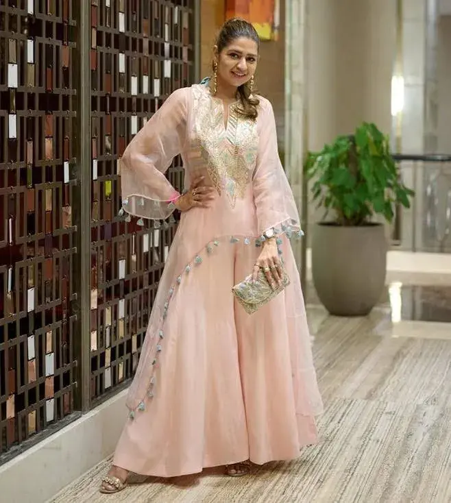 Ain't nobody gonna take their eyes off from this stunning pant set. The delicately embroidered blouse has been put together with free falling pants and hand finished cape. The perfect silhouette is perfect to feel undoubtedly confident. The blouse has been made using georgette, pants has been made using cotton silk while cape is organza. Disclaimer: Product colour may slightly vary due to photographic lighting sources. Country Of Origin - India.