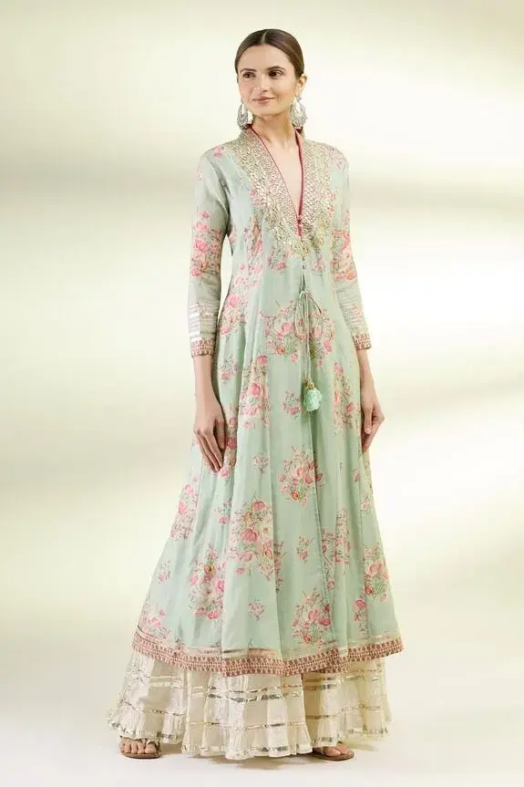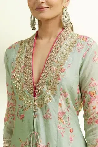 Blue kurta with embroidered and floral printed motifs. Paired with sharara.