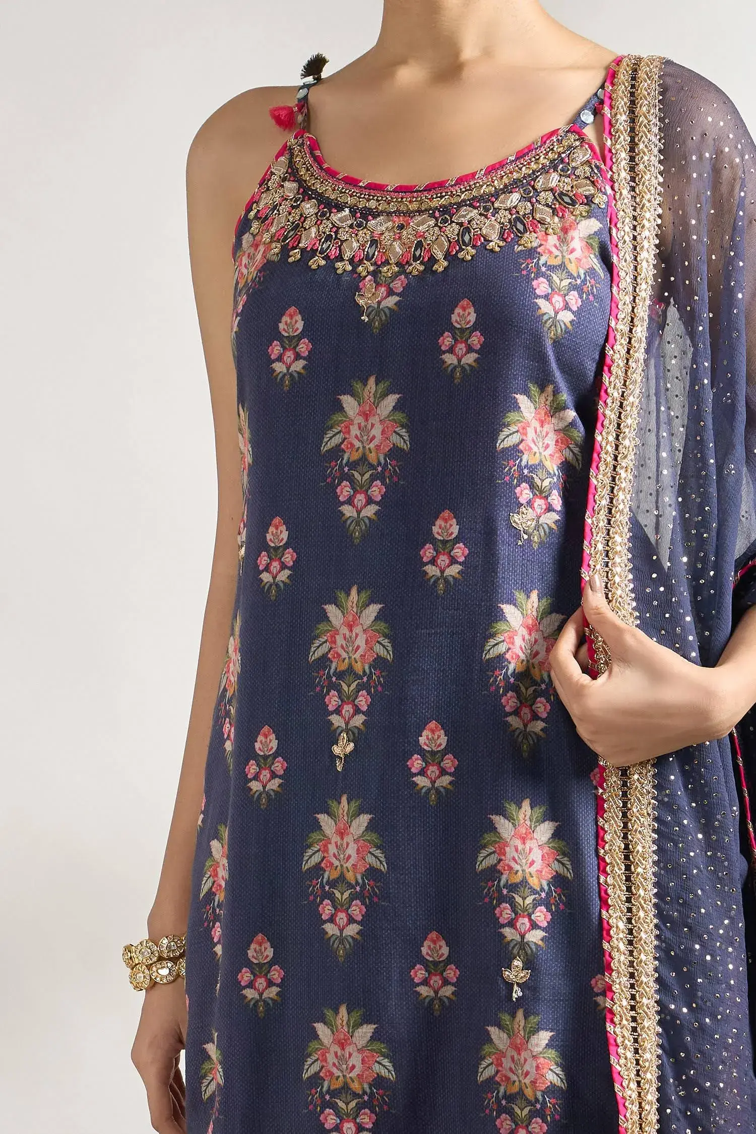 Blue strappy kurta with floral print and gota, sequin, cutdana, mirror embroidered border.