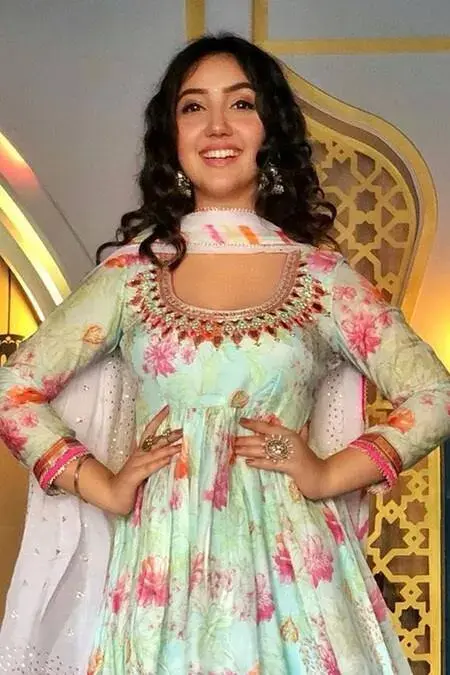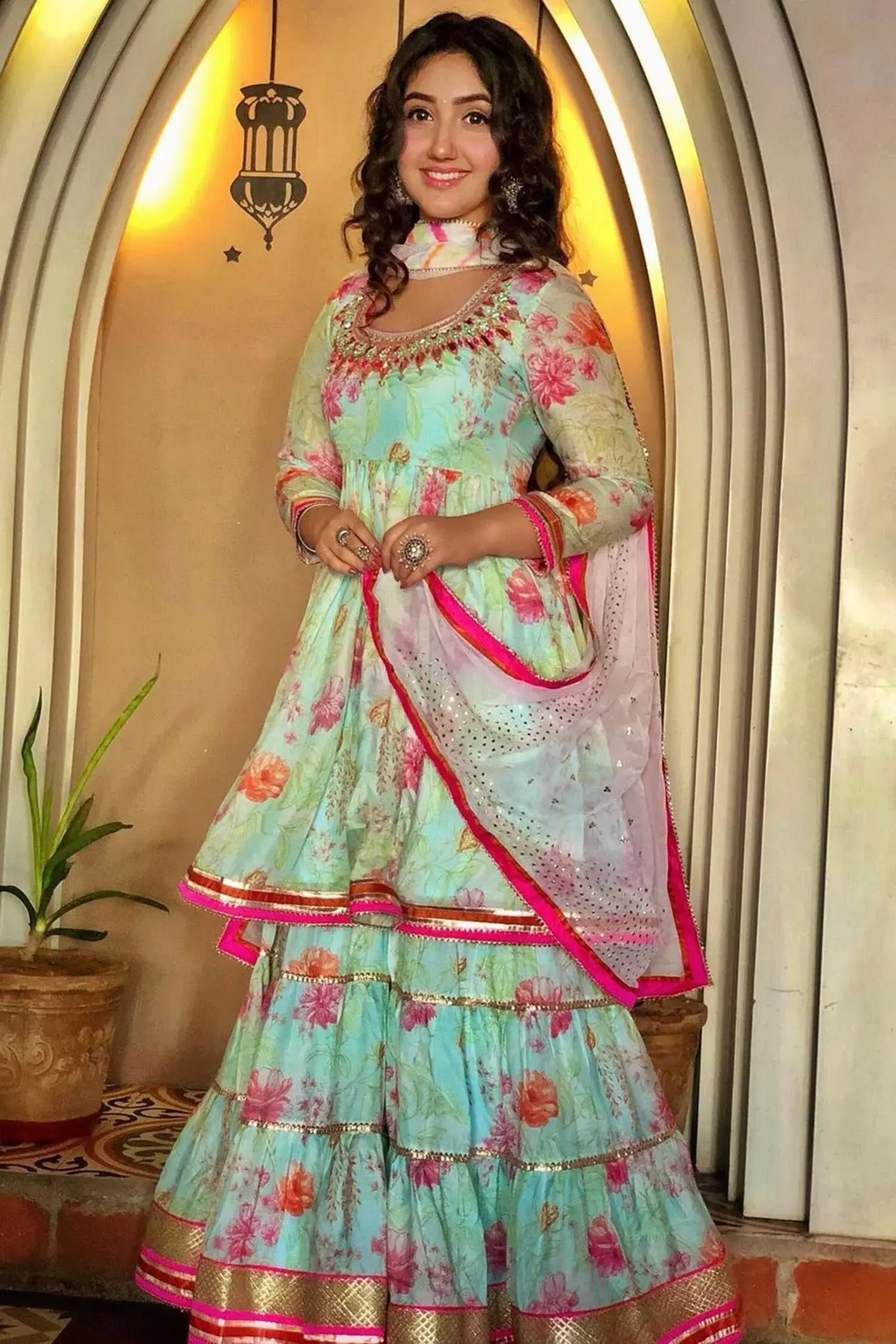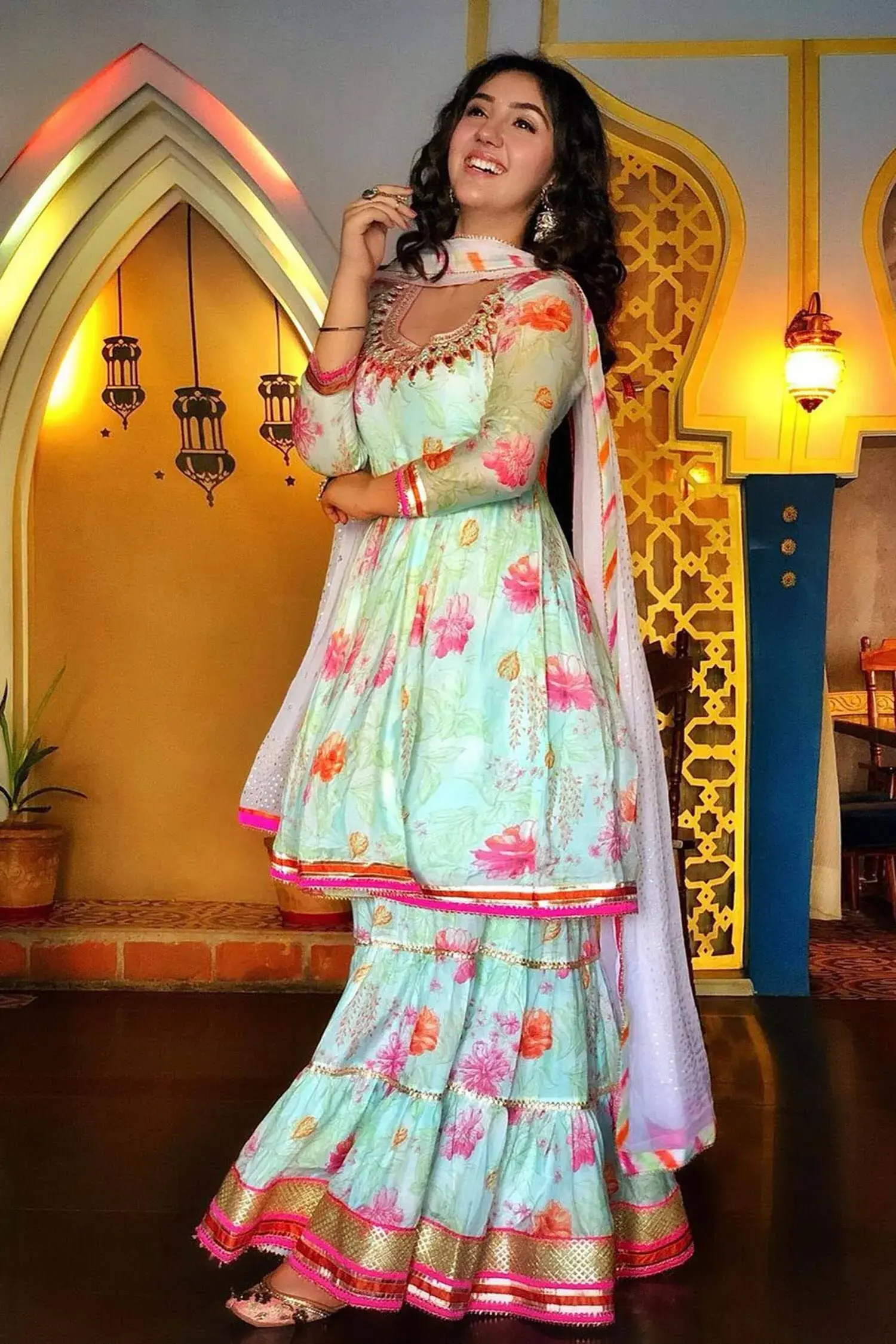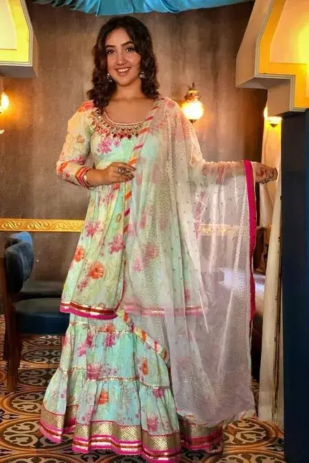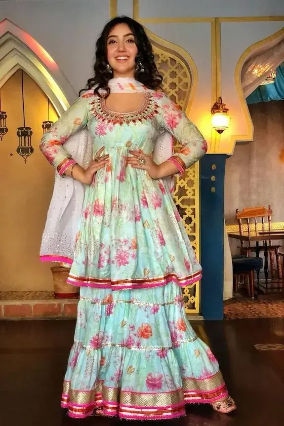 Blue short peplum-kurta with multi-color floral motif work, placement mirror embellishments and gota patti-silk trims. Comes with tiered sharara and badla embroidered dupatta. Component: 3 Embroidered, Printed Neckine: U Neck Sleeve Length: Three Quarter Fabric: Kurta: Cotton Silk; Sharara: Cotton Silk; Dupatta: Chiffon Color: Blue Peplum kurta Tiered sharara Striped border dupatta Gathered flare - Kanika's