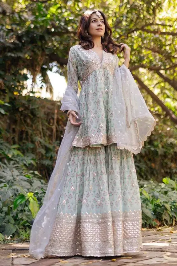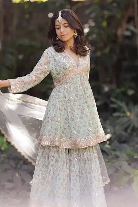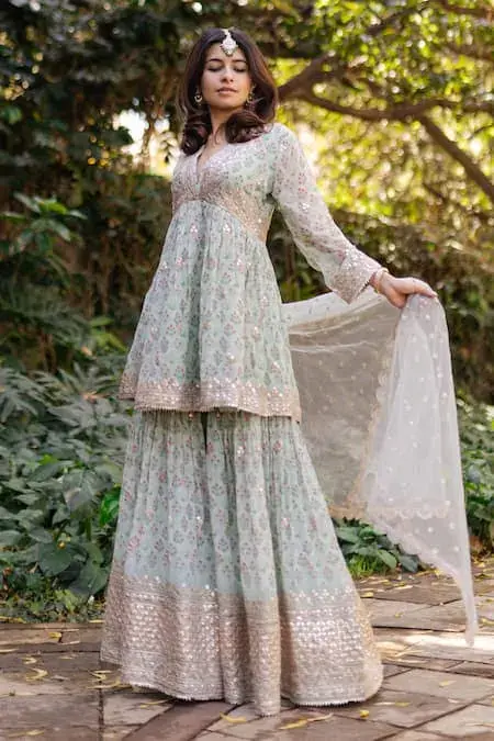 Mint peplum kurta with all over floral ditsy print, highlighted with gota and dori buttis. Paired with a coordinating floral print sharara and dupatta. Components: 3 Pattern: Print, Embroidery Type Of Work: Floral, Gota, Dori Neckline: V Neck Sleeve Type: Full Sleeves Fabric: Dupatta: Net Tikki, Kurta: Georgette, Sharara: Georgette Color: Green Other Details: Kurta: Gota and dori embroidered hem...