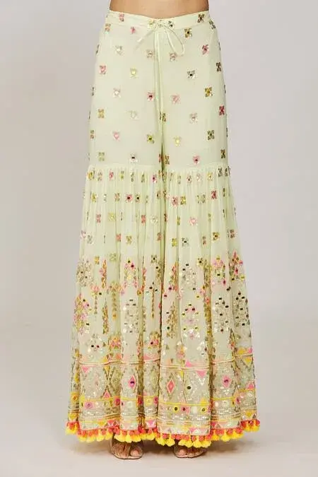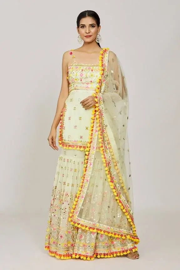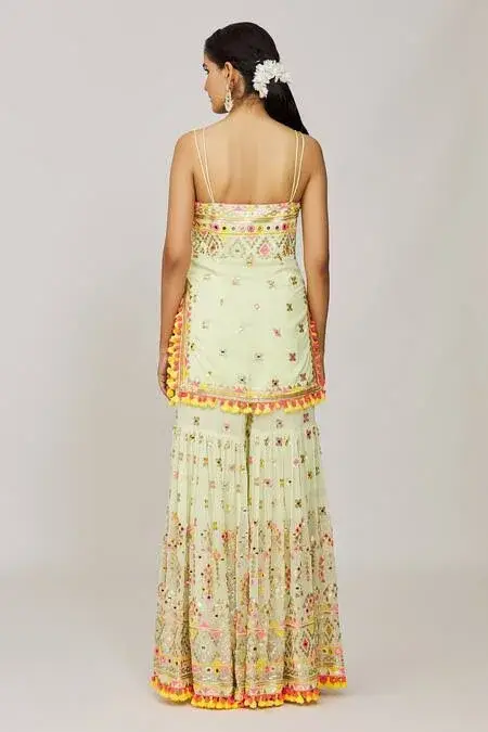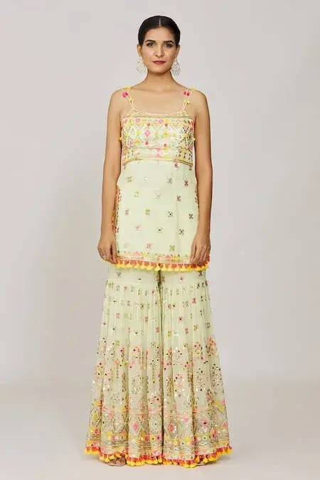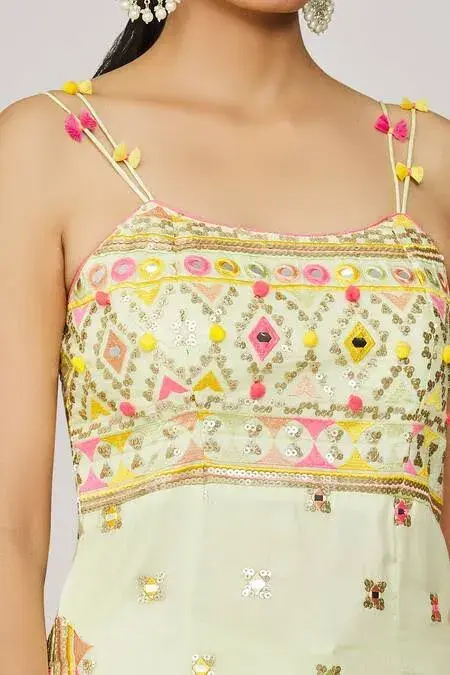 Mint green strappy kurta with mirror and sequin embroidery and pompom and tassel details. Paired with an embroidered sharara and tasseled net dupatta. Components: 3 Pattern: Embroidered Type Of Work: Hand and machine embroidery Neckline: Square Sleeve Type: Sleeveless Fabric: Kurta: Viscose, Sharara: Georgette, Dupatta: Net Color: Green Other Details: Pompom and tassel details Occasion: Mehendi and Haldi - Aza...
