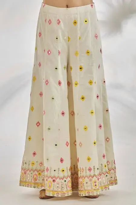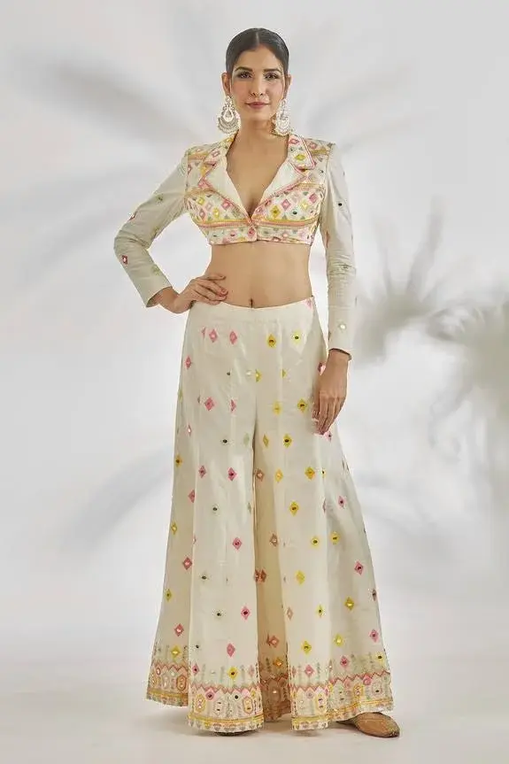 Ivory base cropped jacket, accentuated with contrast thread, mirror embroidery. Paired with a coordinating flared hem pant with mirror embroidered diamond motifs. Components: 2 Pattern: Embroidery Type Of Work: Thread, Mirror Neckline: Collared Neck Sleeve Type: Full Sleeves Fabric: Organic Cotton Color: Ivory Other Details: Sequin, thread and mirror embroidered hemline on pant Occasion: Sangeet - Kanika's