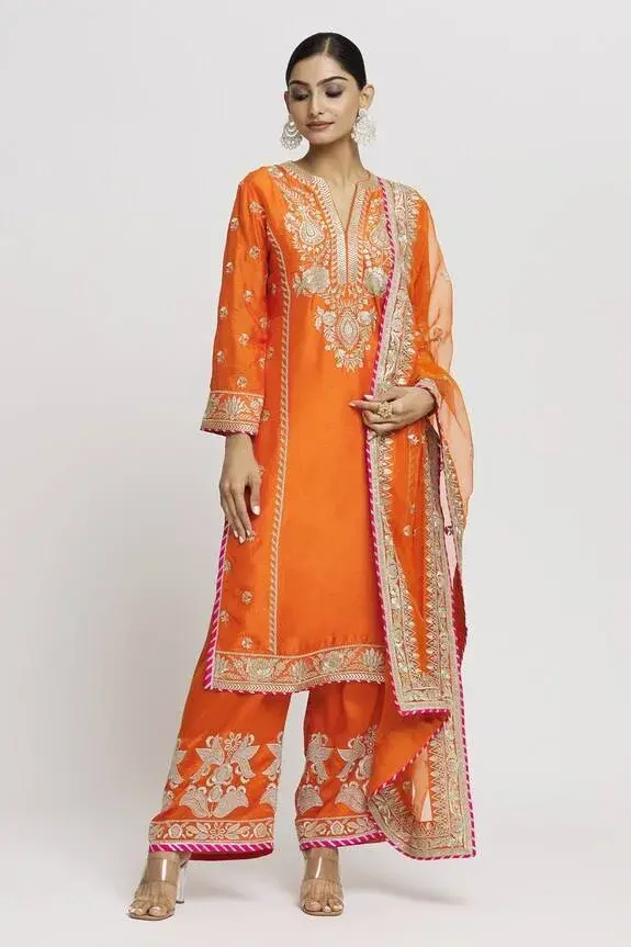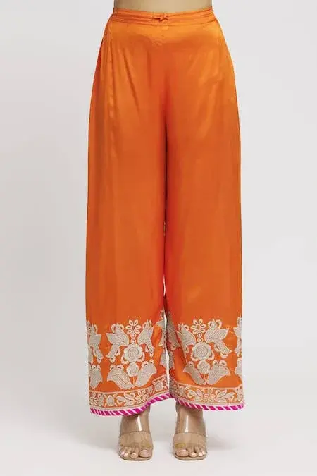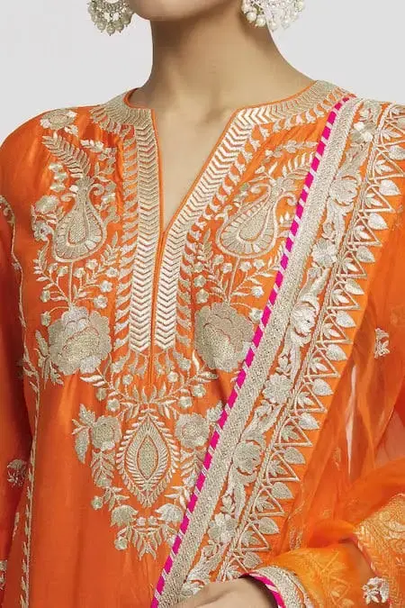 Orange straight kurta with contrast floral, leaves, thread embroidery.