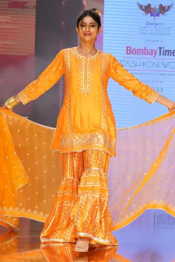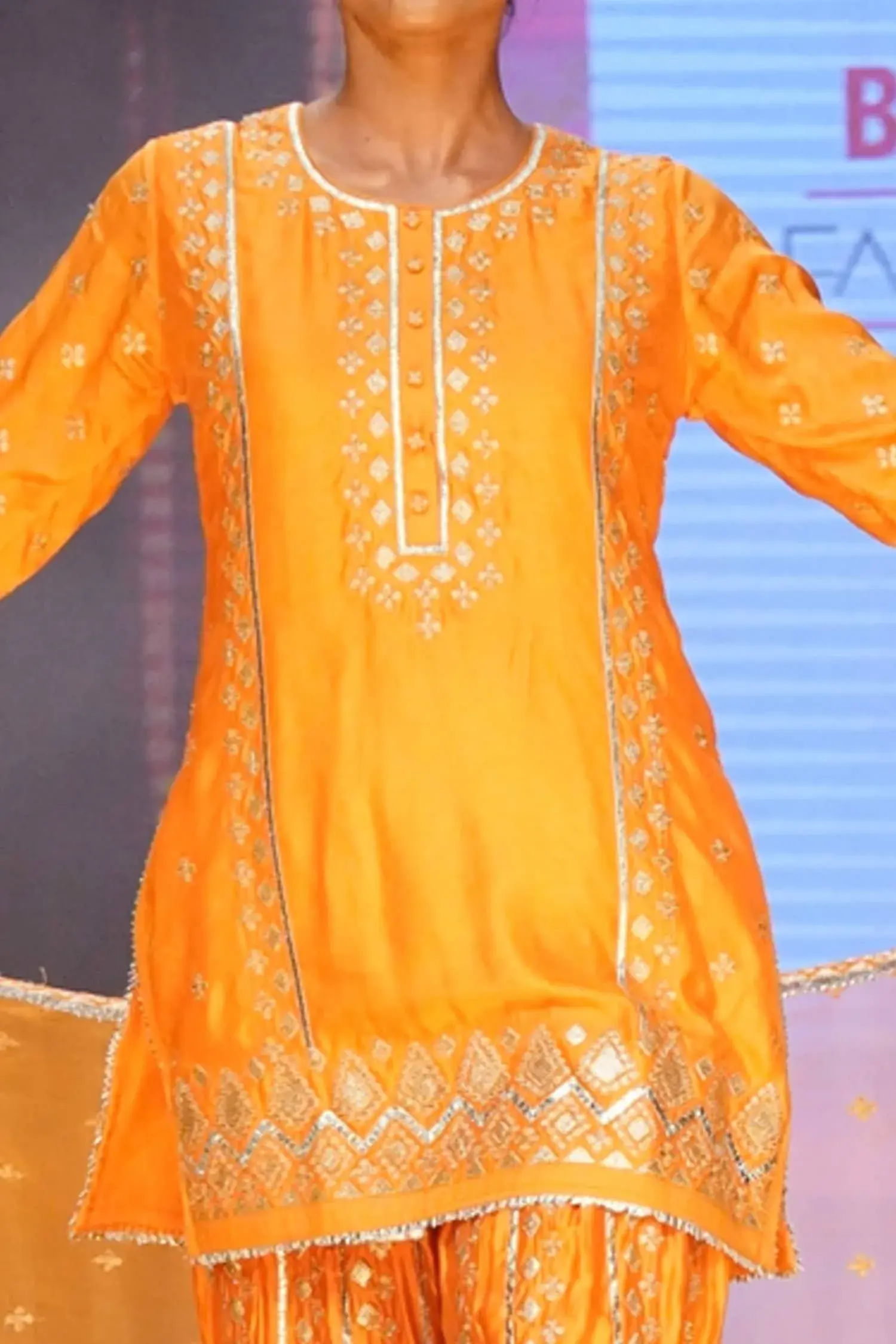 Orange kurta with leaf, gota embroidery. Paired with sharara and dupatta. Component: 3 Pattern: Embroidery Type Of Work: Leaf, gota Neckline: Round Sleeve Type: Long sleeves Fabric: Kurta and Sharara: Tussar Silk, Dupatta: Organza Color: Orange Other Details: Embroidered sheer dupatta Occasion: Sangeet - Kanika's