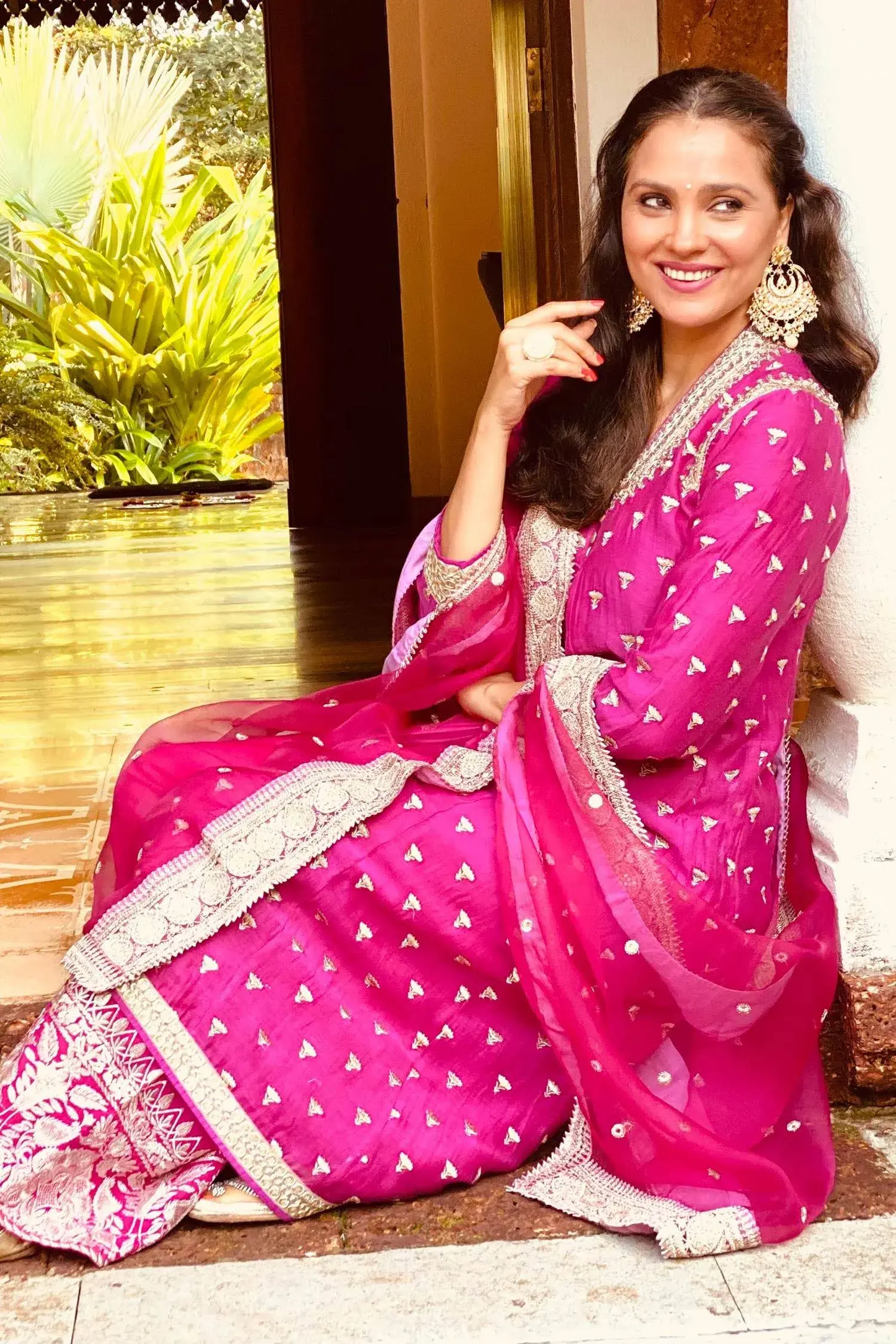 Rani pink jacket-style kurta with all-over lotus motifs and dori-sequin worked neckline.