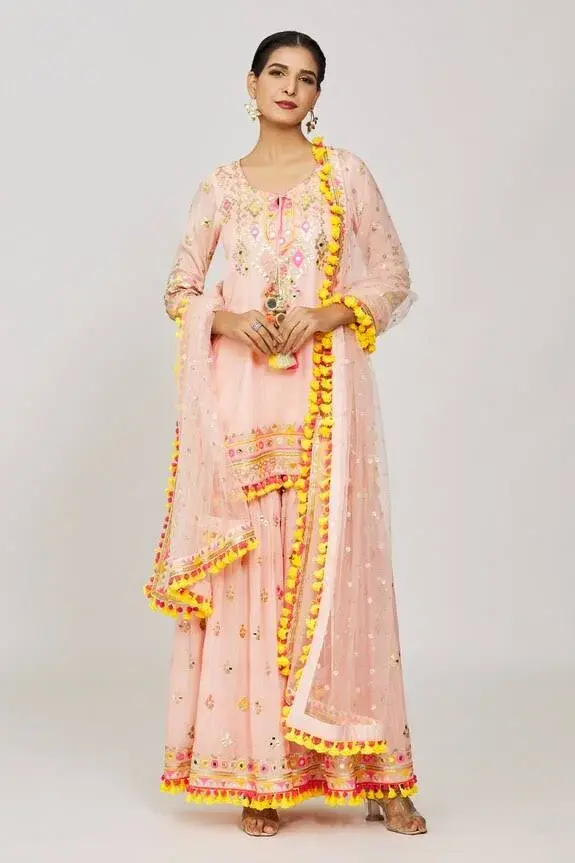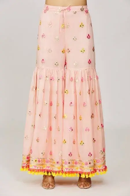 Pink short kurta crafted with all over geometric pattern, monochrome thread, mirror and sequin embroidery. Paired with flared embroidered sharara and dupatta with fringe drop tasselled border Components: 3 Pattern: Embroidered Type Of Work: Thread, Mirror and Sequin Work Neckline: Round Neck Sleeve Type: Three Quarter Sleeves Fabric: Kurta: Viscose, Sharara: Georgette, Dupatta: Organza Color: Pink Other Details: Fringe drop...