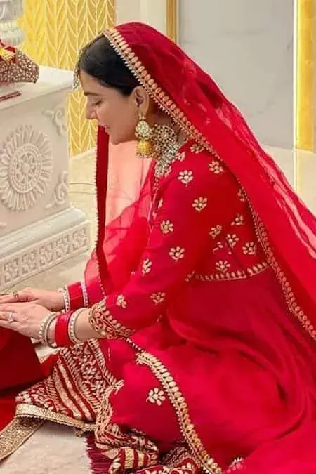 Red kurta with floral embroidered motifs. Paired with embroidered tussar sharara and net dupatta.