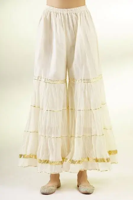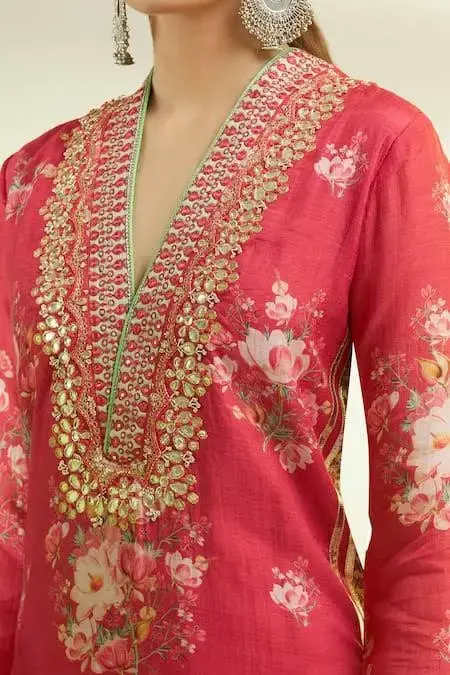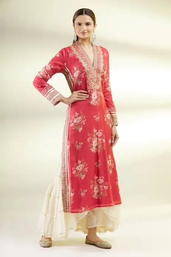 Red kurta with embroidered and floral printed motifs. Paired with sharara.
