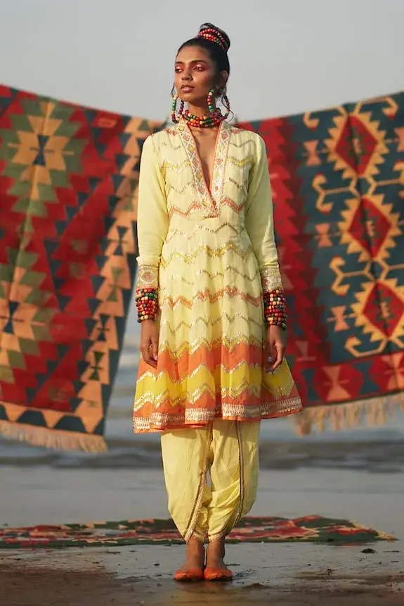 Yellow flared kurta with chevron print and sequin embroidery. Comes with dhoti pants.