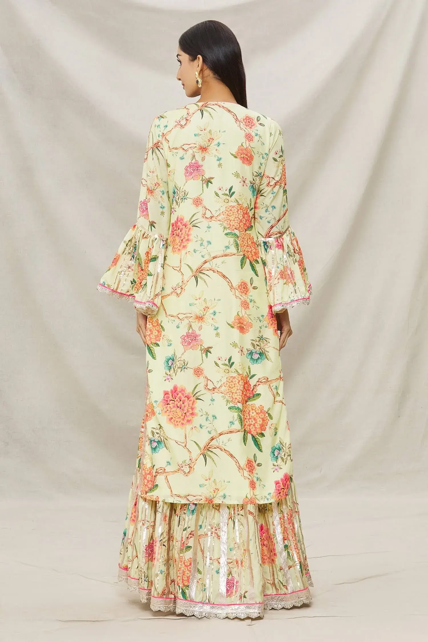 Yellow long kurta with floral prints and embellished yoke. Comes with matching, full ghera sharara and net dupatta.