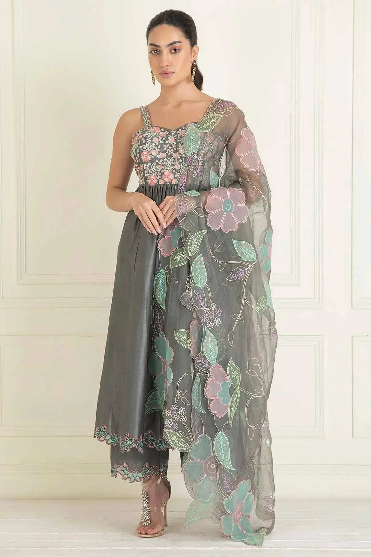 Buy Aastha Jain Bottleship grey chanderi anarkali with floral, sequins embroidery paired with pants & dupatta For Women Available online at ScrollnShops