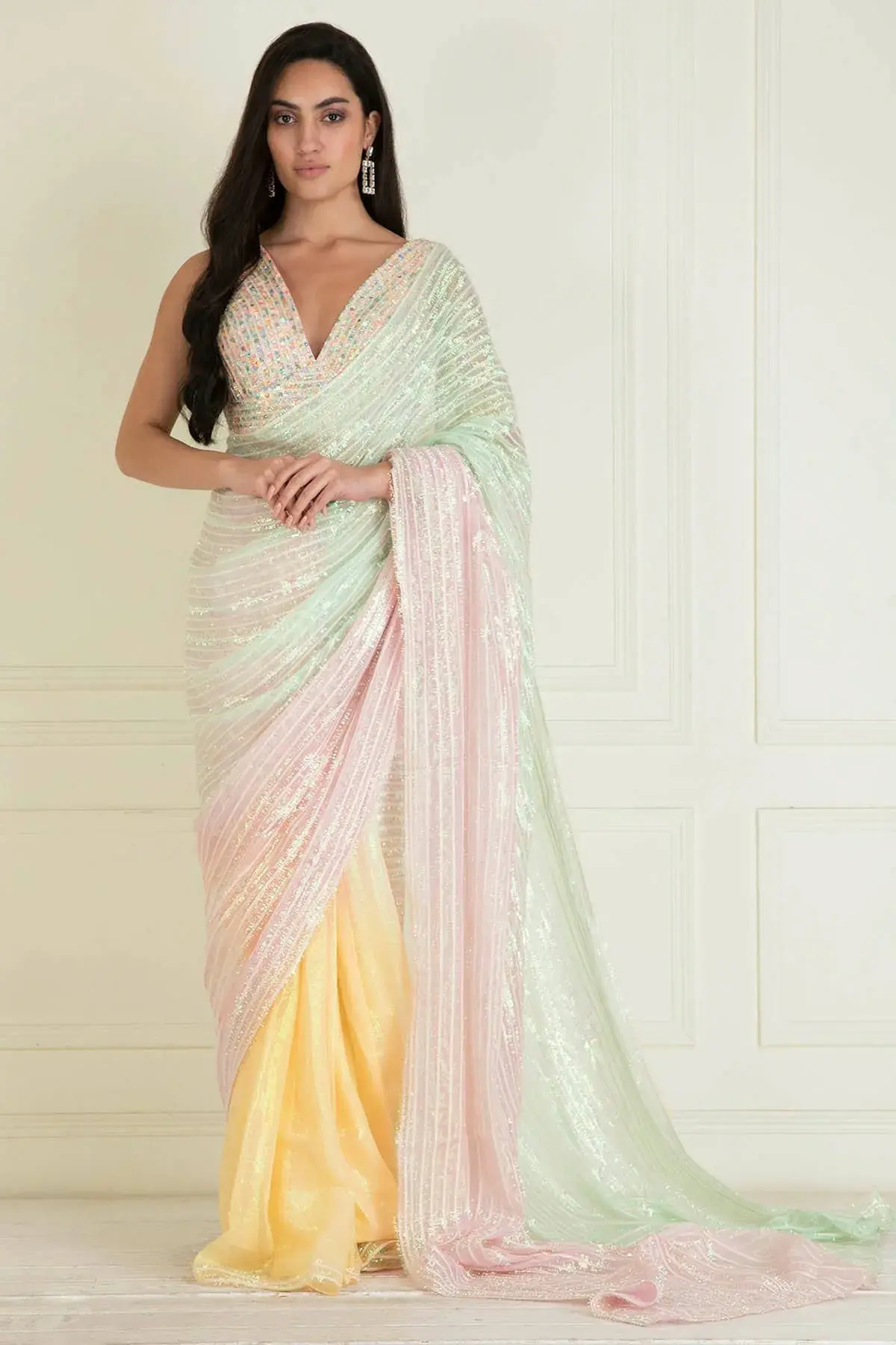 Buy Pastel ombre dye lurex georgette pre stitched saree with sequins embroidery paired with blouse by Designer Aastha Jain For Women Available online at ScrollnShops