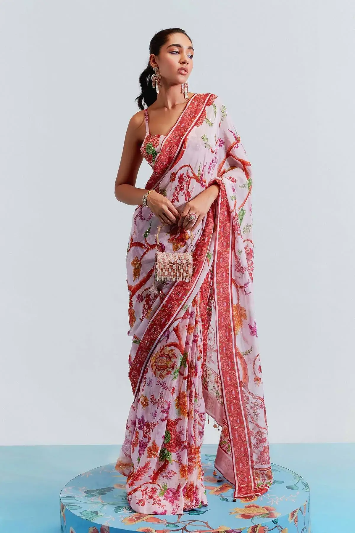 Blush organza pre-stitched saree with floral prints and embroidered highlights. Comes with satin organza embroidered blouse.