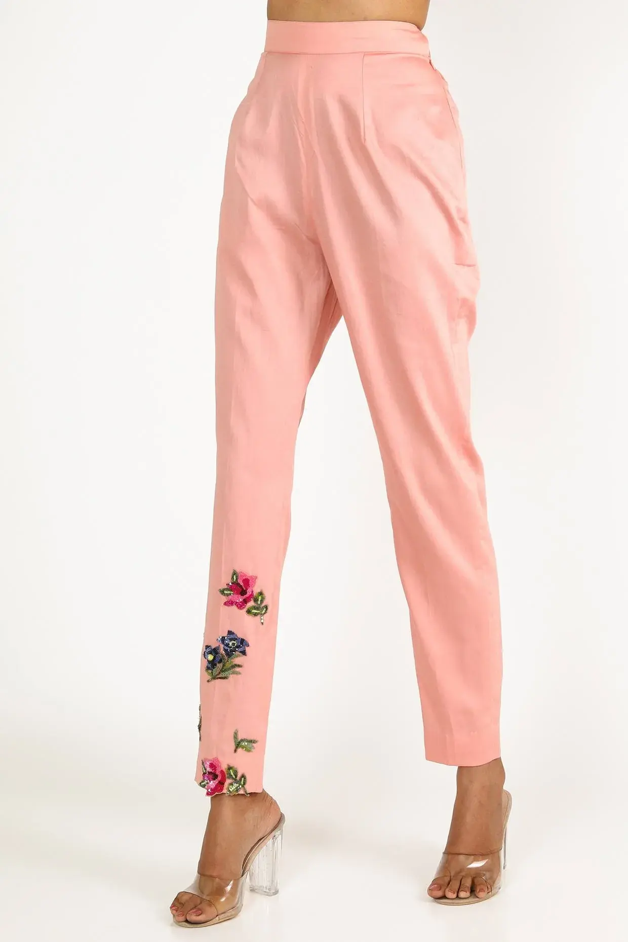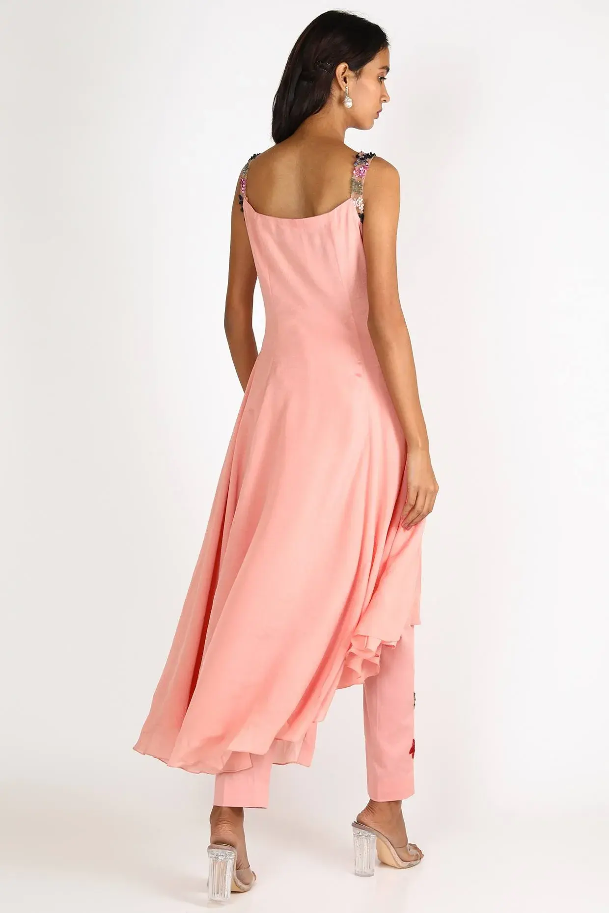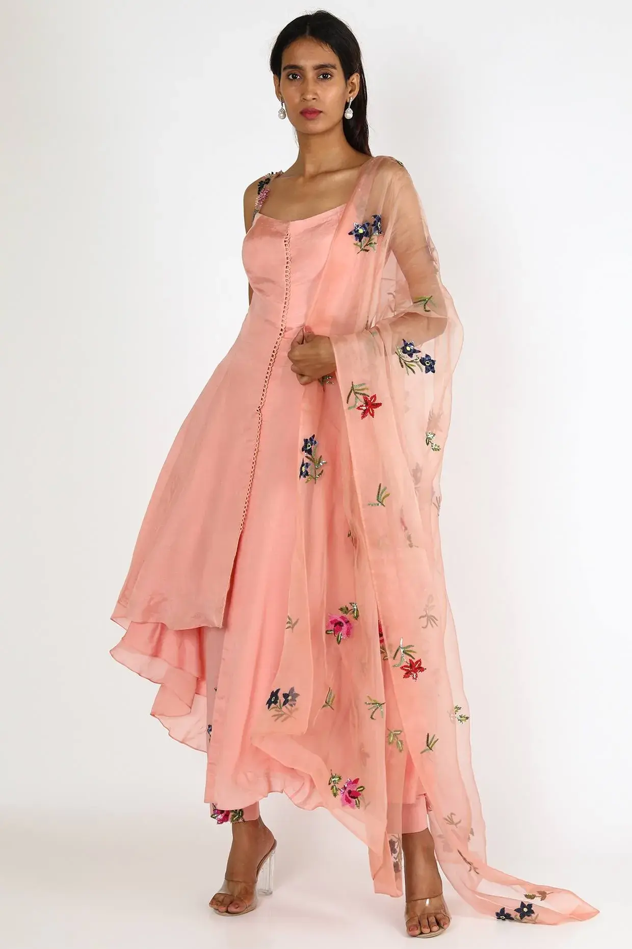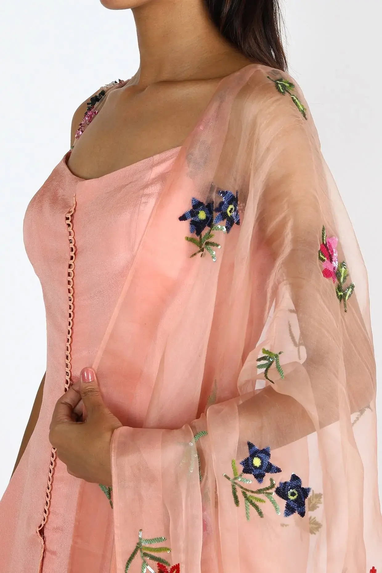 Featuring A Blush Pink Kurta In Chinon Base With Print. It Is Paired With Matching Cotton Embellished Pants And An Organza Dupatta. Fit: Fitted At Bust And Waist. Composition: Chinnon, Organza, Cotton. Care: Dry Clean Only.