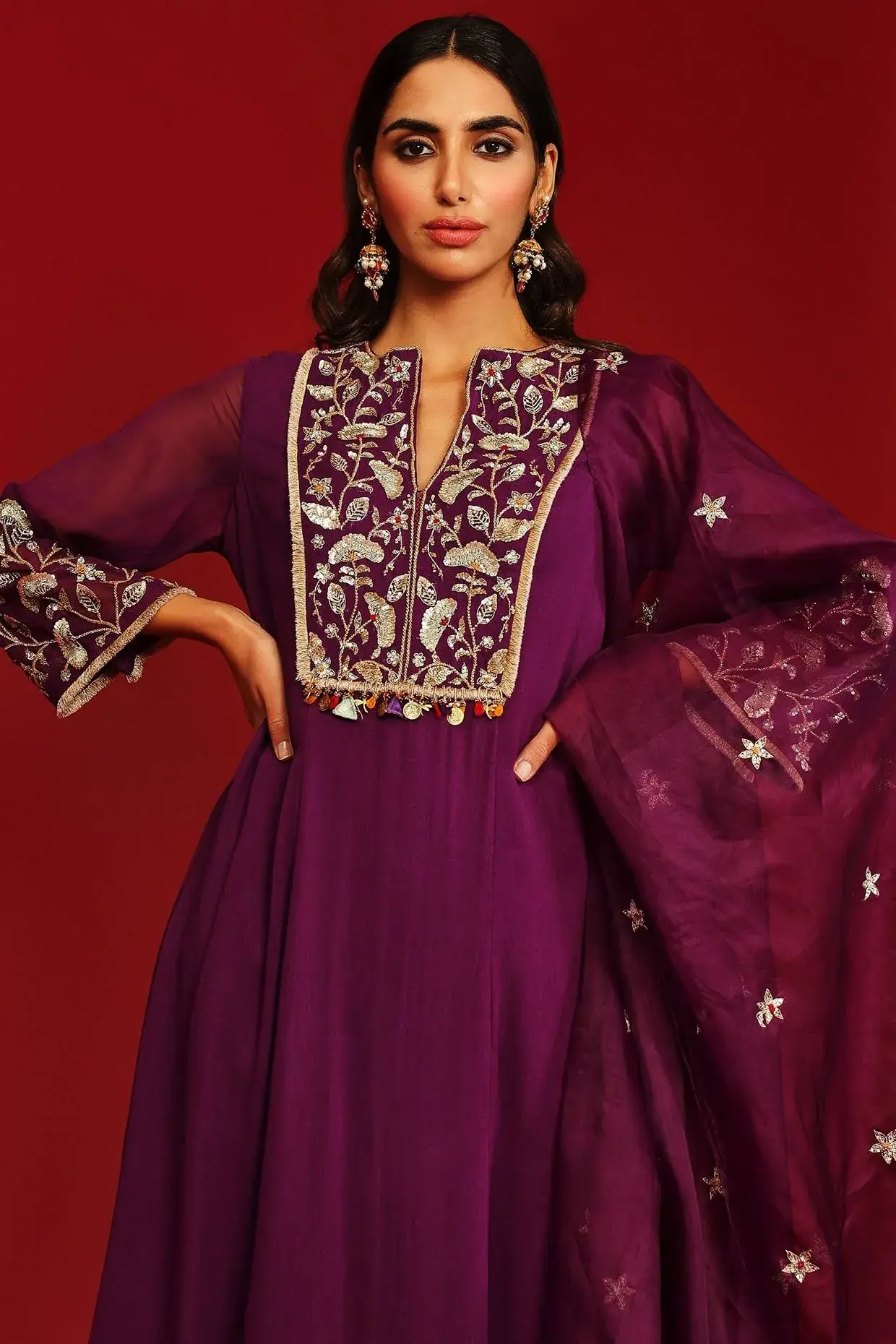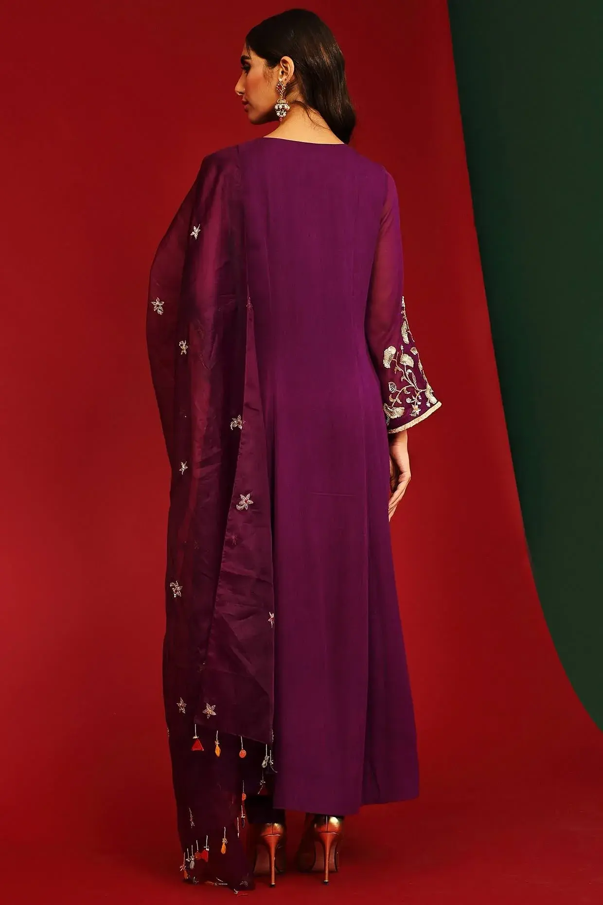 Featuring A Grapevine Kurta In Georgette Base With Embroidery. It Is Paired With Matching Pants And An Embroidered Dupatta Having Hand Made Tassels. Fit: Fitted At Bust And Waist. Composition: Georgette. Care: Dry Clean Only.