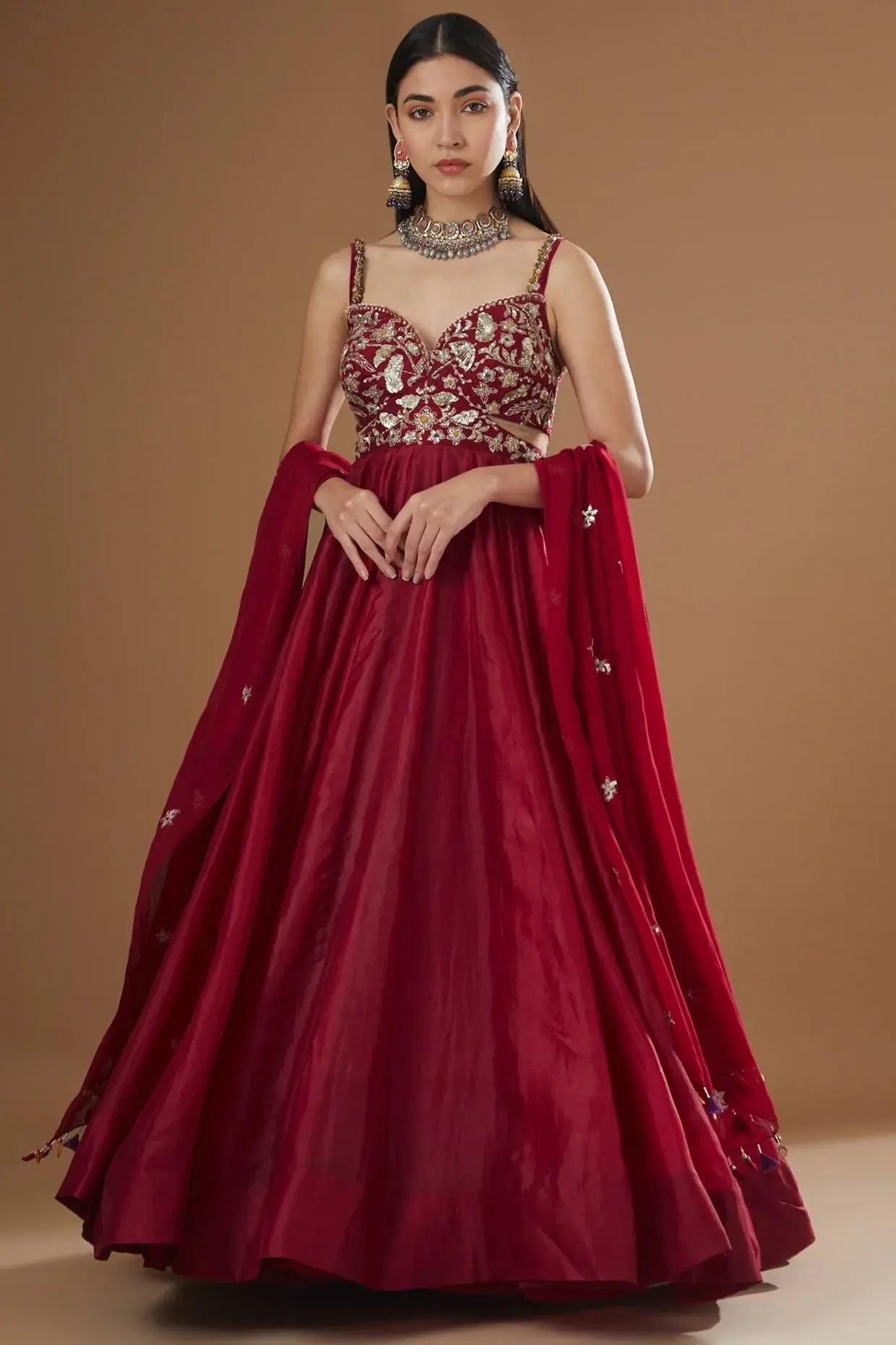 Featuring A Red Anarkali In Organza Base With Embroidery. It Is Paired With A Matching Printed Dupatta Having Tassels. Fit: Fitted At Bust. Composition: Organza. Care: Dry Clean Only.