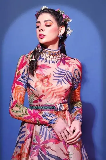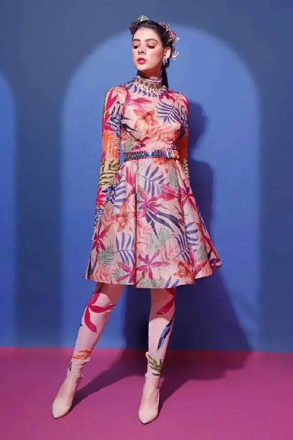 Beige fit and flare tunic-dress with all-over floral motif work. Comes with embellished belt and lycra leggings. Components:3 Embroidered, Printed Neckline:Round Sleeve Length:Full Fabric:Organza,lycra, net, shantoon Color:Beige Fit and flare silhouette - Kanika's