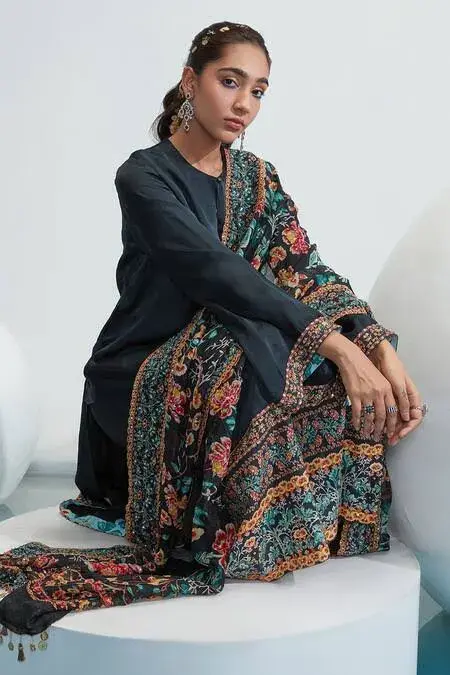 Black satin organza kurta with multi colored floral printed hem with embroidered highlights. Comes with embroidered pant and organza embroidered dupatta. Component: 3 Pattern: Embroidered, Printed Type Of Work: Floral Motifs Neckline: Round Sleeve Type: Full Fabric: Satin Organza, Textured Cotton, Organza, Shantoon Color: Black Other Details: Tassel hem dupatta Front keyhole on kurta Side pocketed kurta Occasion: Sangeet -...