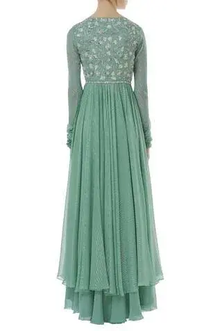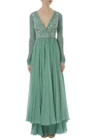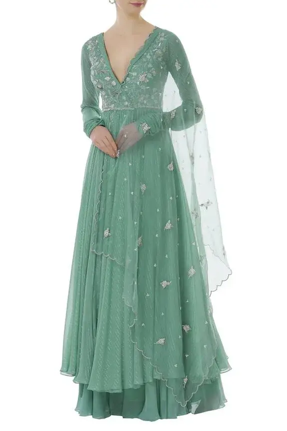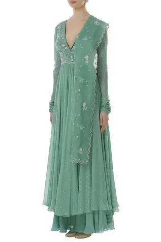 Green embelished angrakha kurta. Comes with georgette palazzo and embellished dupatta. Components:3 Bead, Sequin Neckline:V neck Sleeve Length:Full Fabric:Georgette, Shantoon, Organza Color:Green Closure: Kurta: Drawstrings Pant: Side zip Gathered pleates - Kanika's