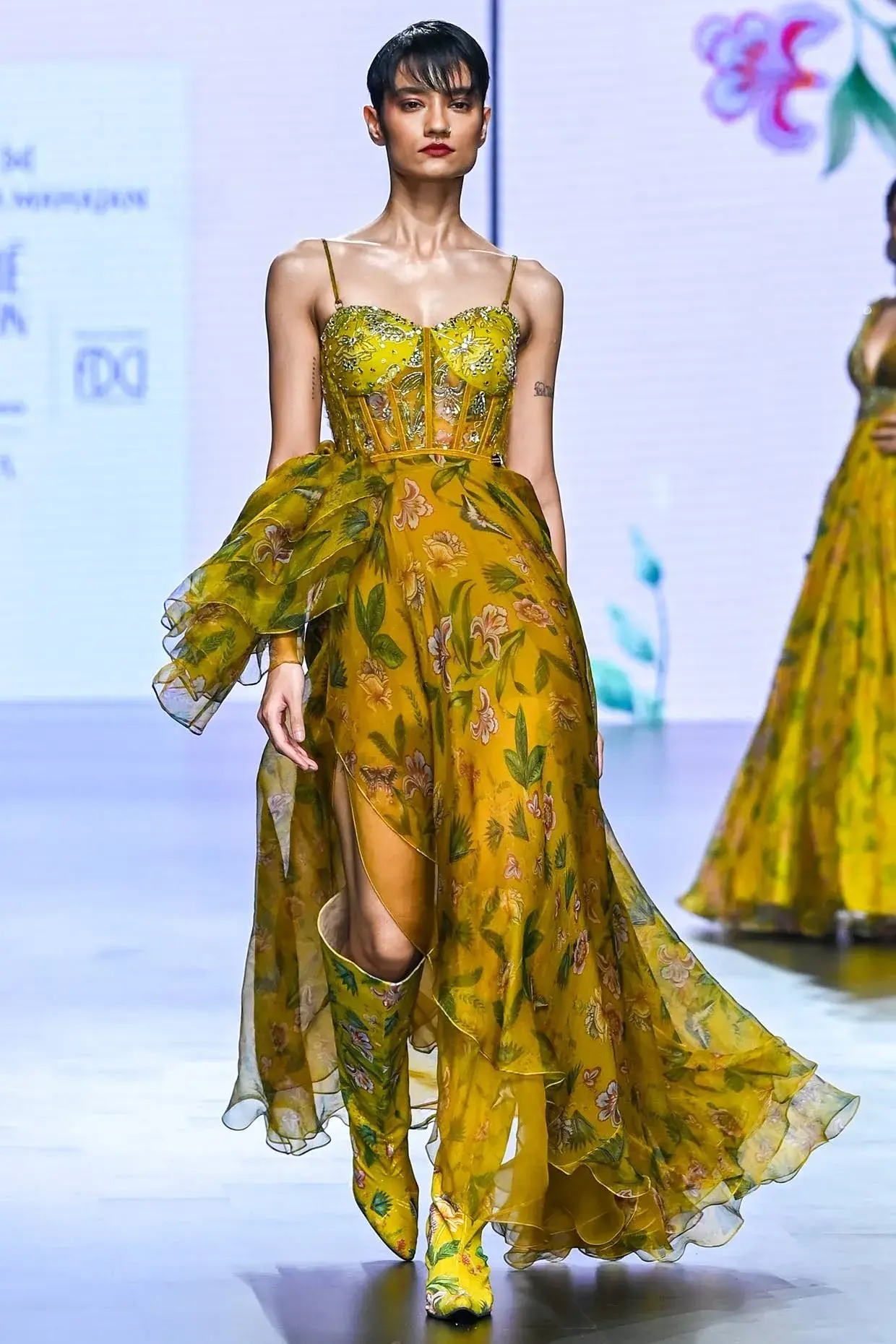 Eesha Mahajan Features A Mesmerizing Yellow Gown That Captivates With Its Elegance. The Eye-Catching Piece Is Crafted In Organza And Soft Net With Embroidery. Accessorize The Designer Gown With Statement Earrings And Heels For Cocktail Parties, Showcasing Style And Sophistication. Components: 1 Fit: Fitted At Bust. Composition: Organza, Soft Net. Care: Dry Clean Only.