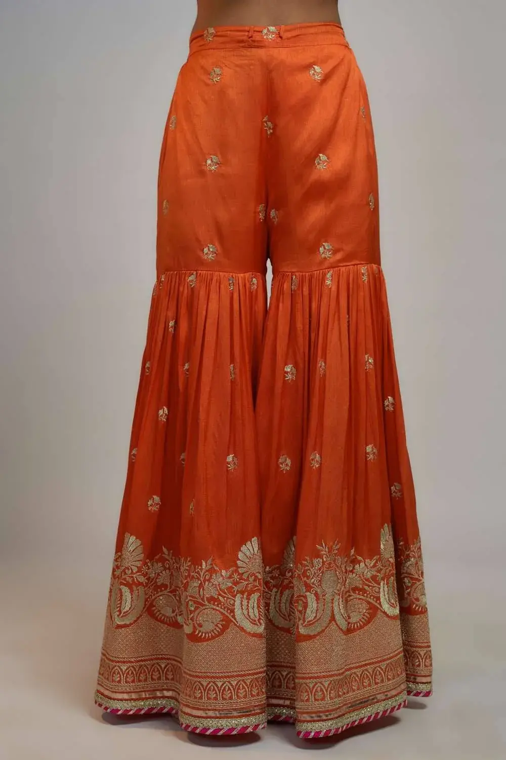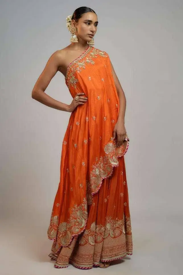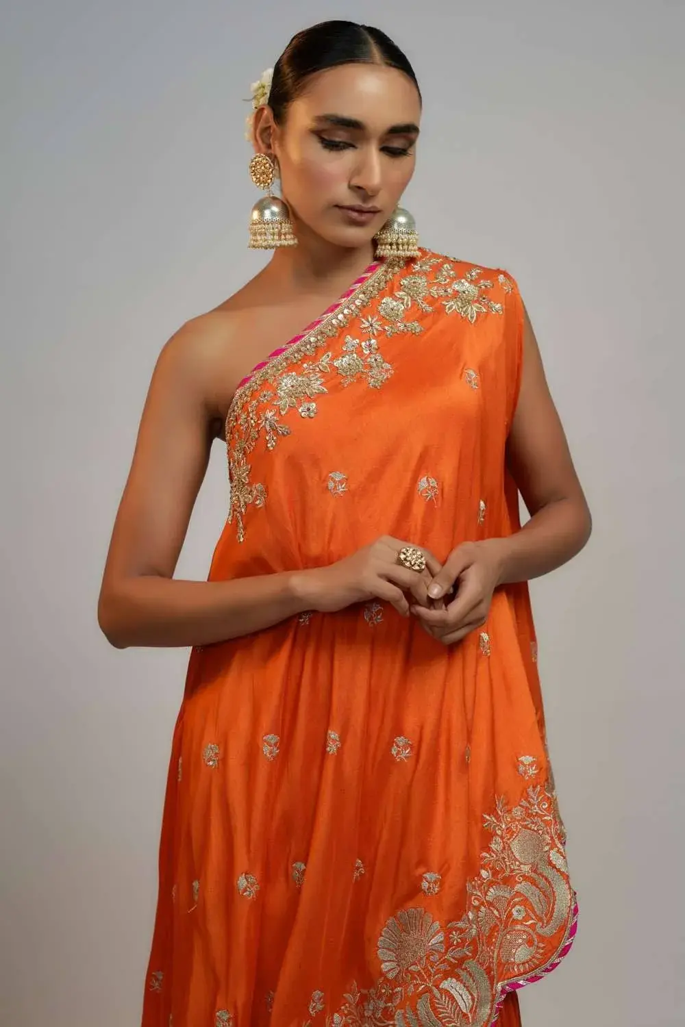 A smart, one-shoulder top meets a sharara adorned in gold embroidery. Tailored for captivating events, it promises fluidity in movement and lasting impressions. Crafted in exquisite Tussar.