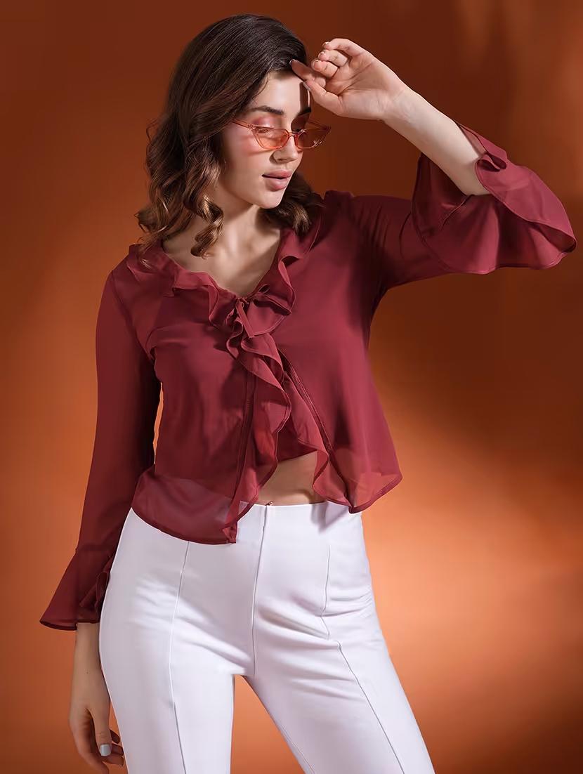 globus women maroon ruffles tie-up neck bell sleeves georgette party top